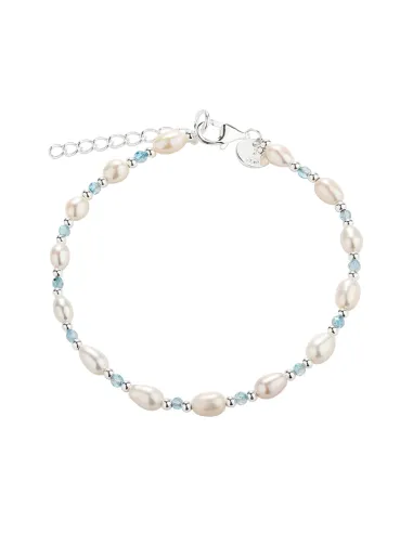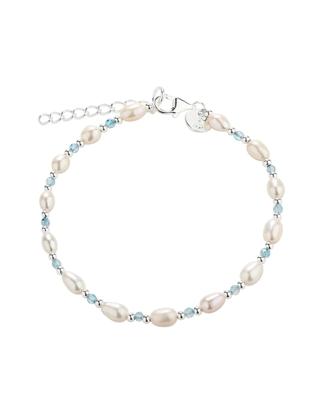 Armbånd med hvide ferskvandsperler, lyseblå perler & små sølv kulger.