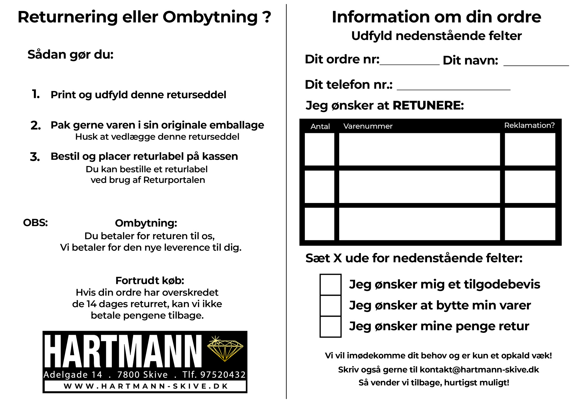 Såfremt dit produkt har tydelige skader eller mangler ved modtagelse, bedes du skrive til os på kontakt@hartmann-skive.dk