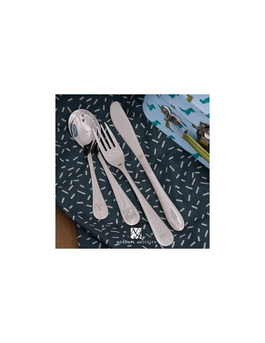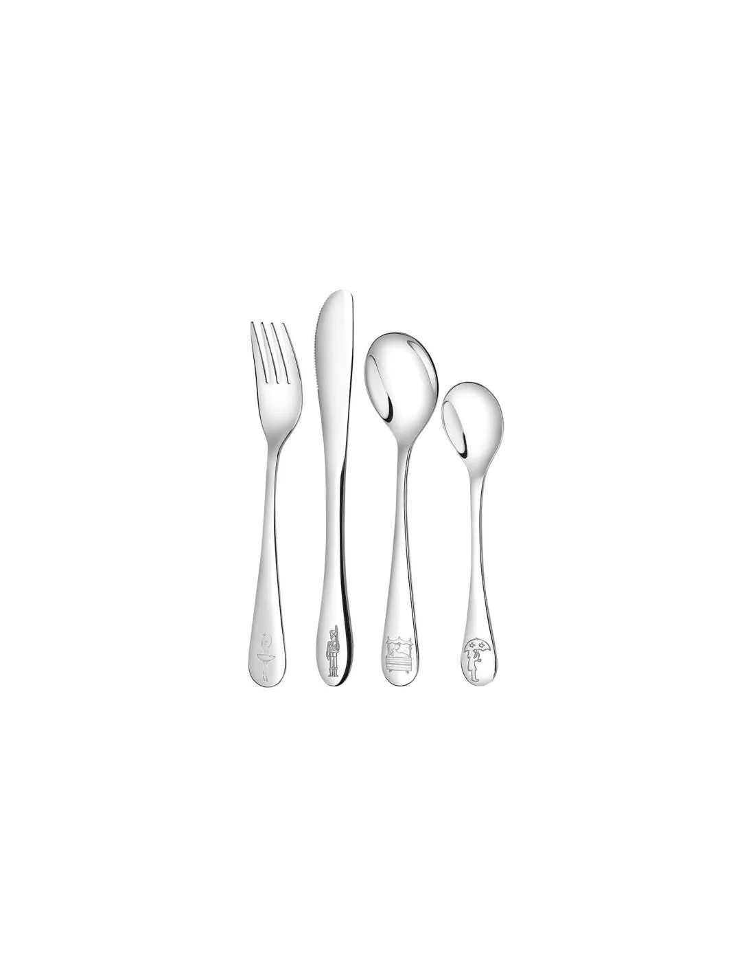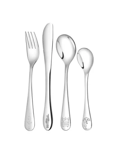 Enkelt og stilfuldt rustfrit børnebestik med eventyrmotiver fra de velkendte H.C. Andersen eventyr. Sættet indeholder kniv, gaffel, spiseske og teske. Alle er med motiver på forsiden. Teske: Ole Lukkeøje, Gaffel: Ballerina, Kniv: Tinsoldat og Ske: Prinsessen på ærten. Et rigtigt sødt og eventyrligt bestiksæt til børn, som er oplagt som fødselsdagsgave, dåbsgave eller barselsgave. Bestikket tåler opvaskemaskine.