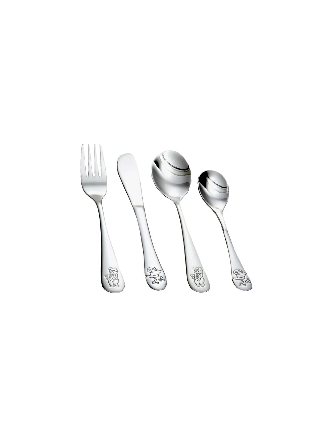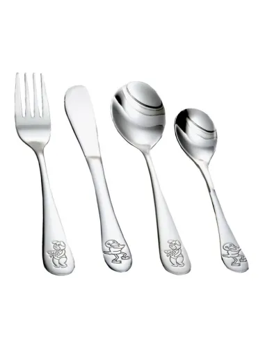 Enestående børnebestik med den kære Bamse og den fjumrede Kylling. Børnebestikket er udført i rustfrit stål. Sættet består af, kniv, gaffel, spiseske og teske. Et rigtigt fint bestiksæt til børn, som er oplagt som fødselsdagsgave, dåbsgave, barselsgave eller til dit barn som skal lære at spise selv.