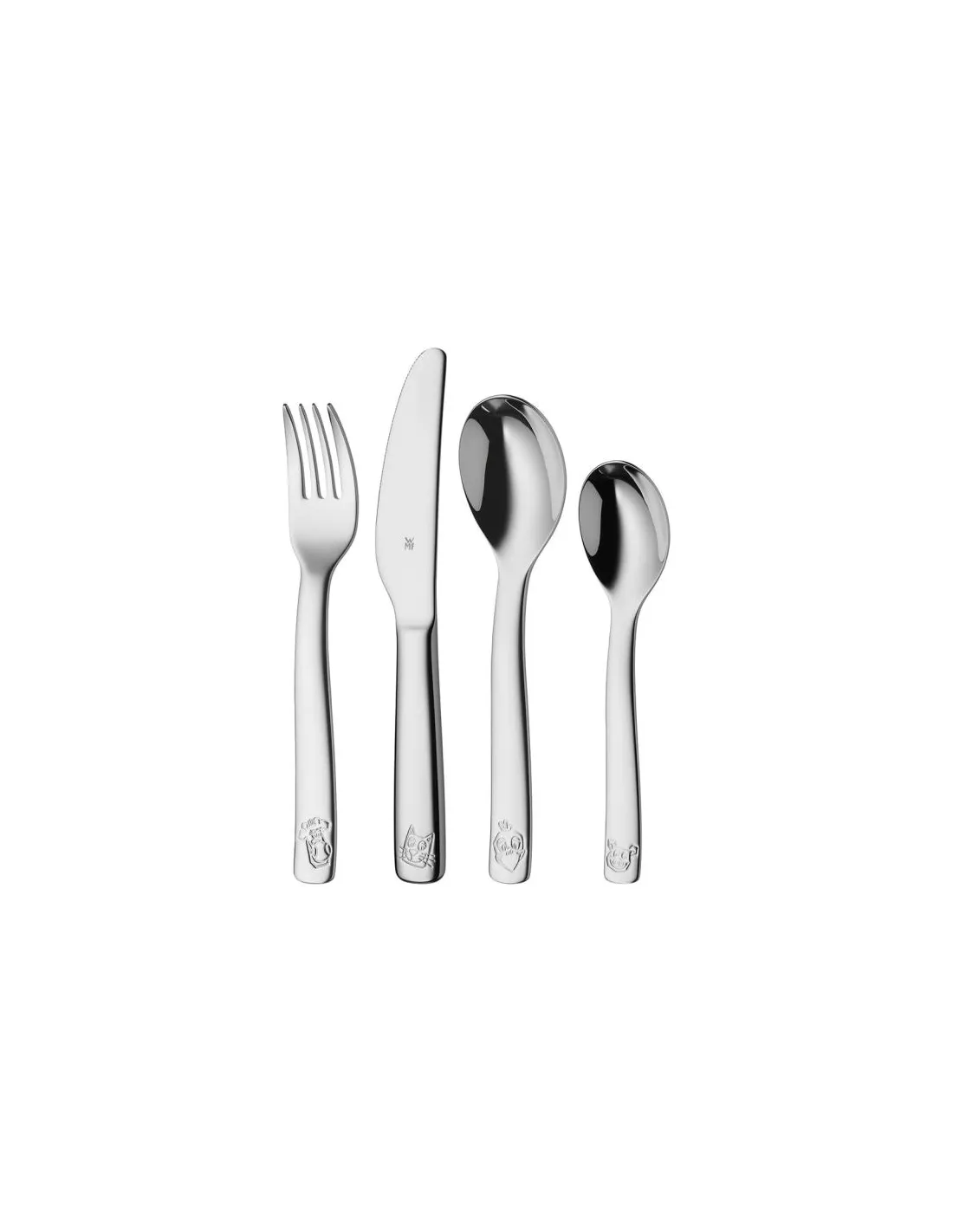 WMF-bondegårdsbestik i rustfrit stål. Sættet består af fire dele – en kniv, en gaffel, en spiseske og en teske. Bestikket er dekoreret med fine små dyr fra bondegården. På gaflen er der en ko, på kniven en kat, på spiseskeen en høne og på tesken en fin lille gris. Skal du til barnedåb, navngivning eller fødselsdag? Så går du aldrig fejl hvis du vælger at give dette fine bestiksæt. Bestikket tåler opvaskemaskine.