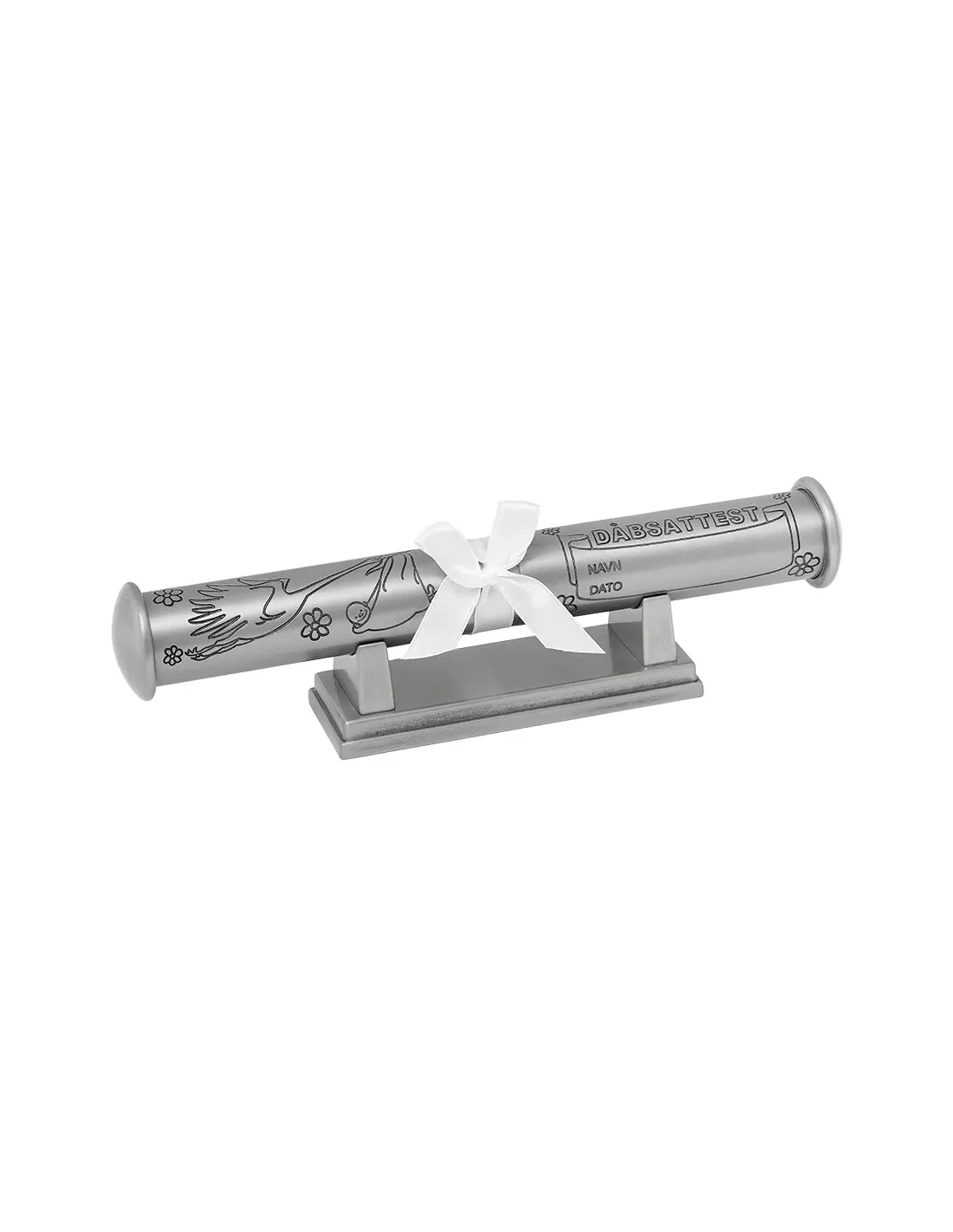 Unikt og fint fortinnet dåbsrør med fod til opbevaring af dåbsattesten. Røret er dekoreret med en stork, som symbolsk figur brugt til at hilse den lille baby velkommen. Dåben er en dag, der er værd at mindes og fejres. Til enhver fejring hører naturligvis også gaver med. Dåbsrøret er uden tvivl en unik og meget populær måde, at byde en lille ny velkommen på. Røret benyttes typisk til opbevaring af barnets dåbsattest, men udover dåbsattesten, kan røret også indeholde andre personlige dokumenter, som f.eks. breve og lykønskninger i forbindelse med dåben. Med et dåbsrør undgår du at dåbsattesten bliver krøllet og bukket, så den kan bevares i mange år.