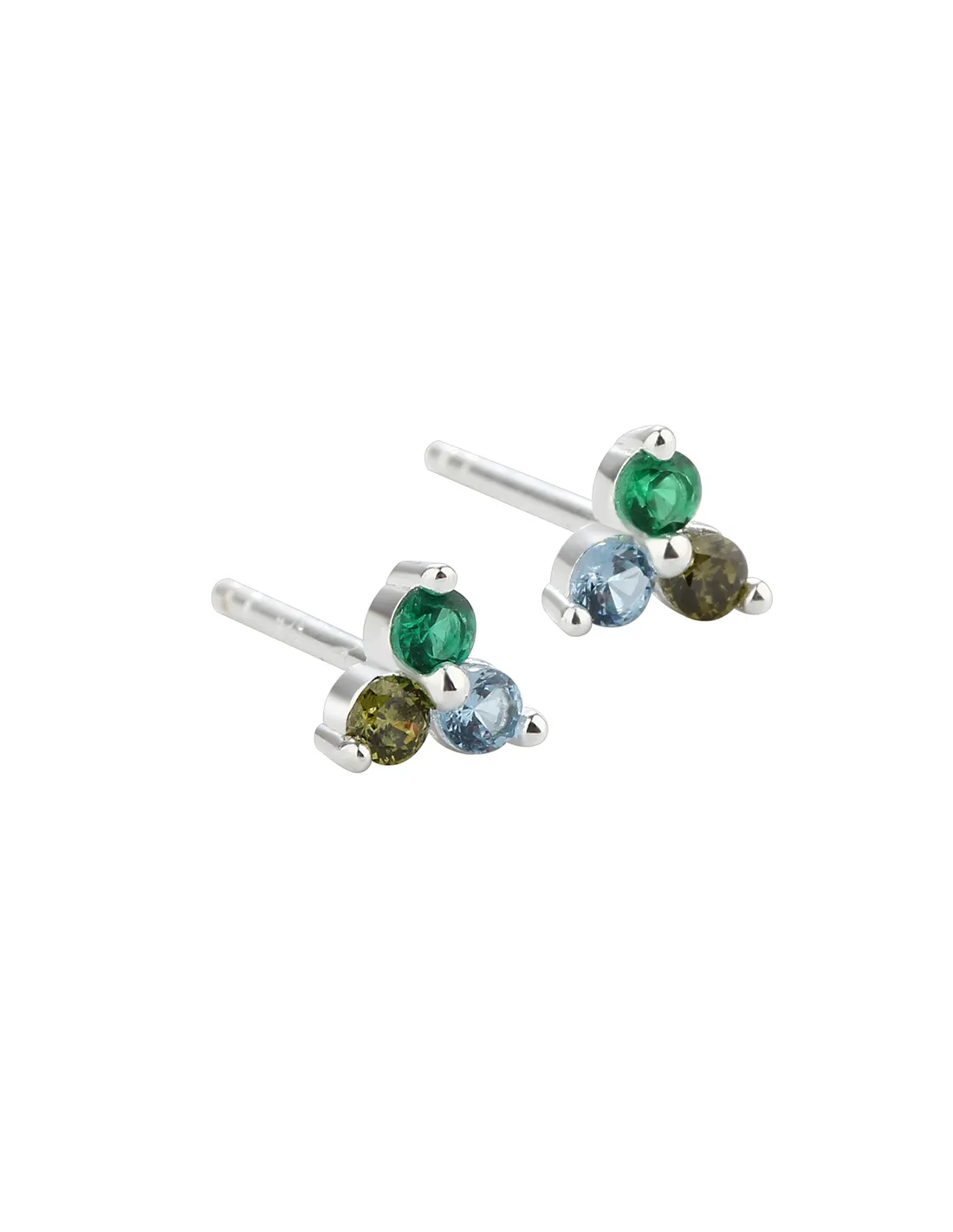 Ørestikker i sterling sølv med 3 små zirkonia i grøn, oliven & lyseblå.