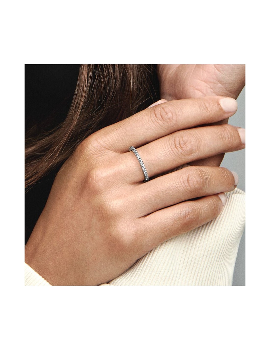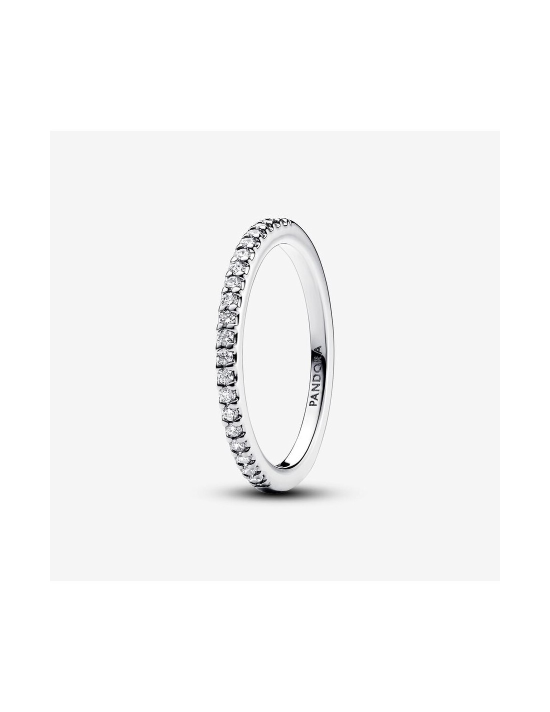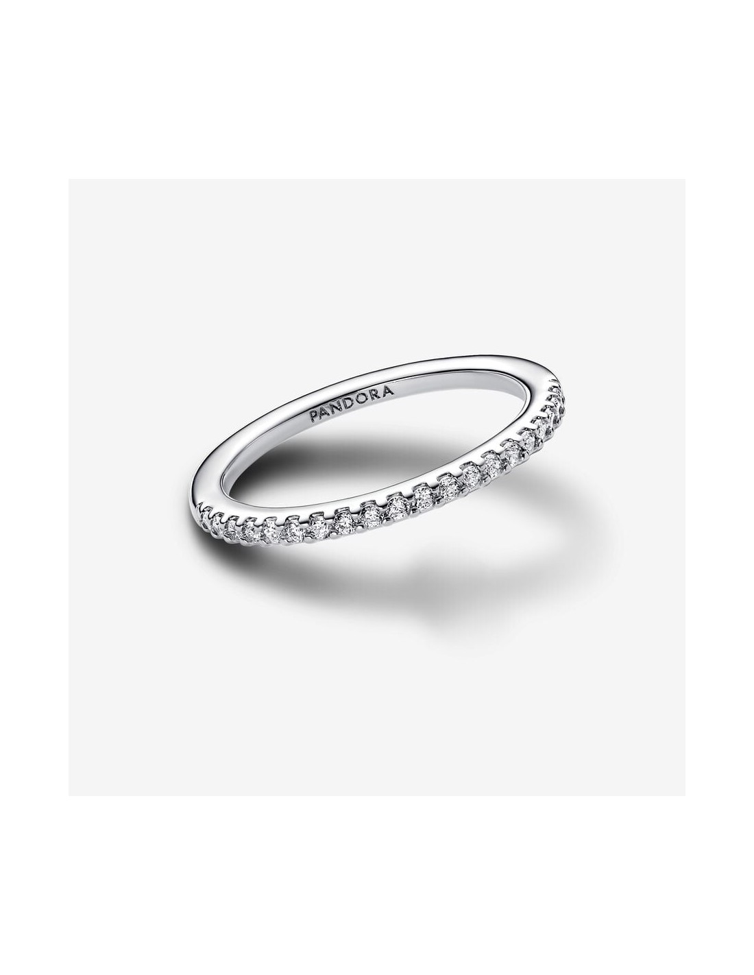 Vælg elegant glans, når du bærer den funklende båndring. Denne ring i sterling sølv er et uundværligt smykke i enhver kollektion og er indfattet med en række af klar kubisk zirkonia. Pavérækken stråler fra den forreste yderste halvdel af båndet, som har en firkantet profil. Kig ind i båndet for at se det indgraverede ikoniske Pandora logo. Uanset om du bærer den alene for lidt glitter eller sætter den sammen med andre ringe, vil denne kubisk zirkonia ring pifte din hverdag op.