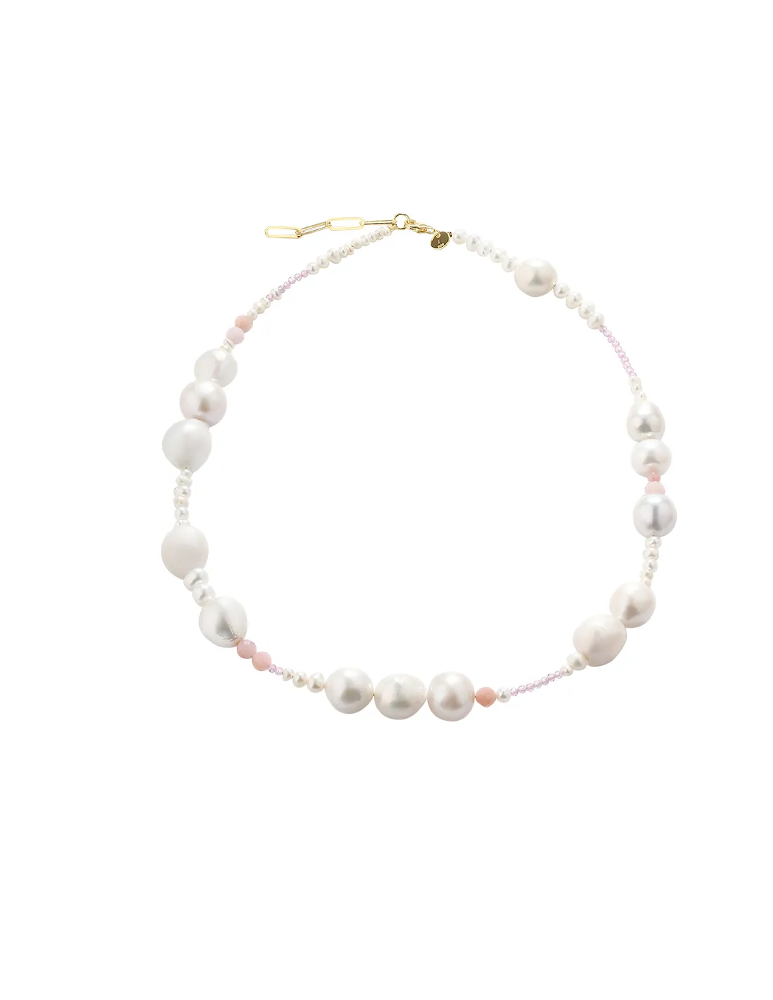 Halskæde med hvide barokke ferskvandsperler & rosa perler.