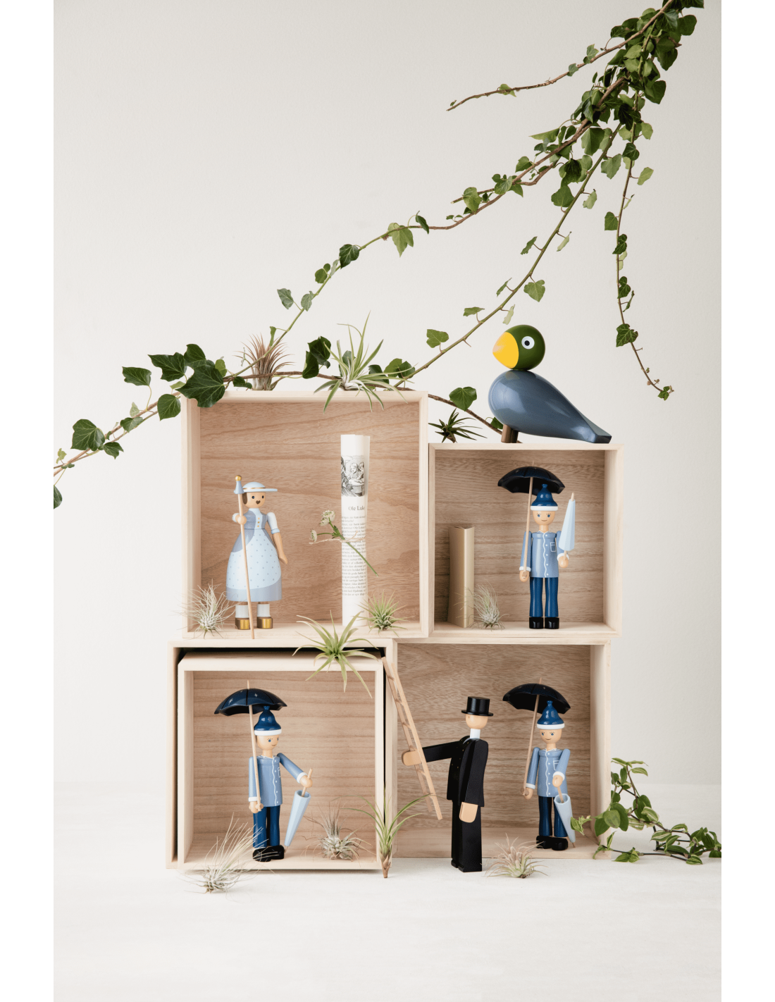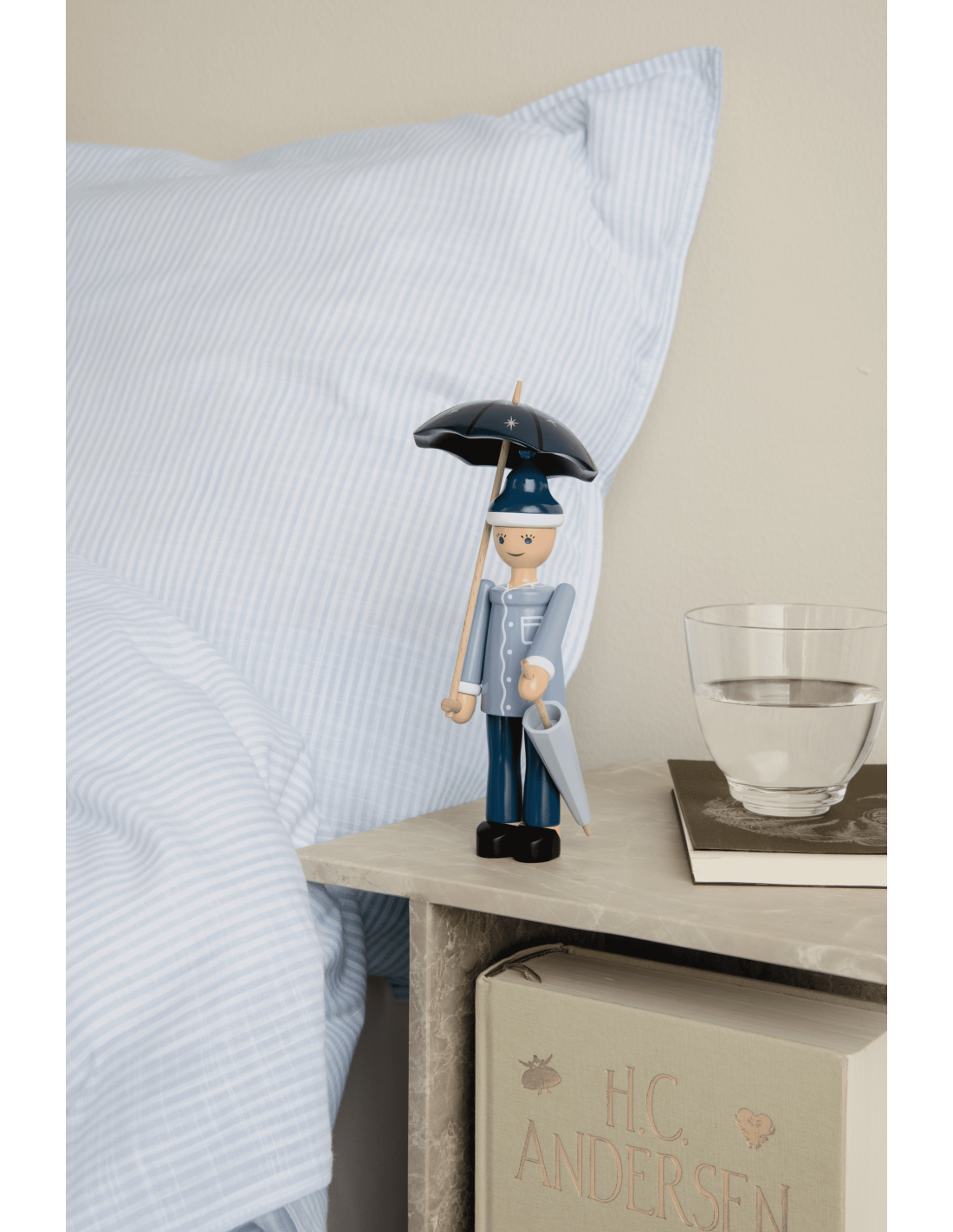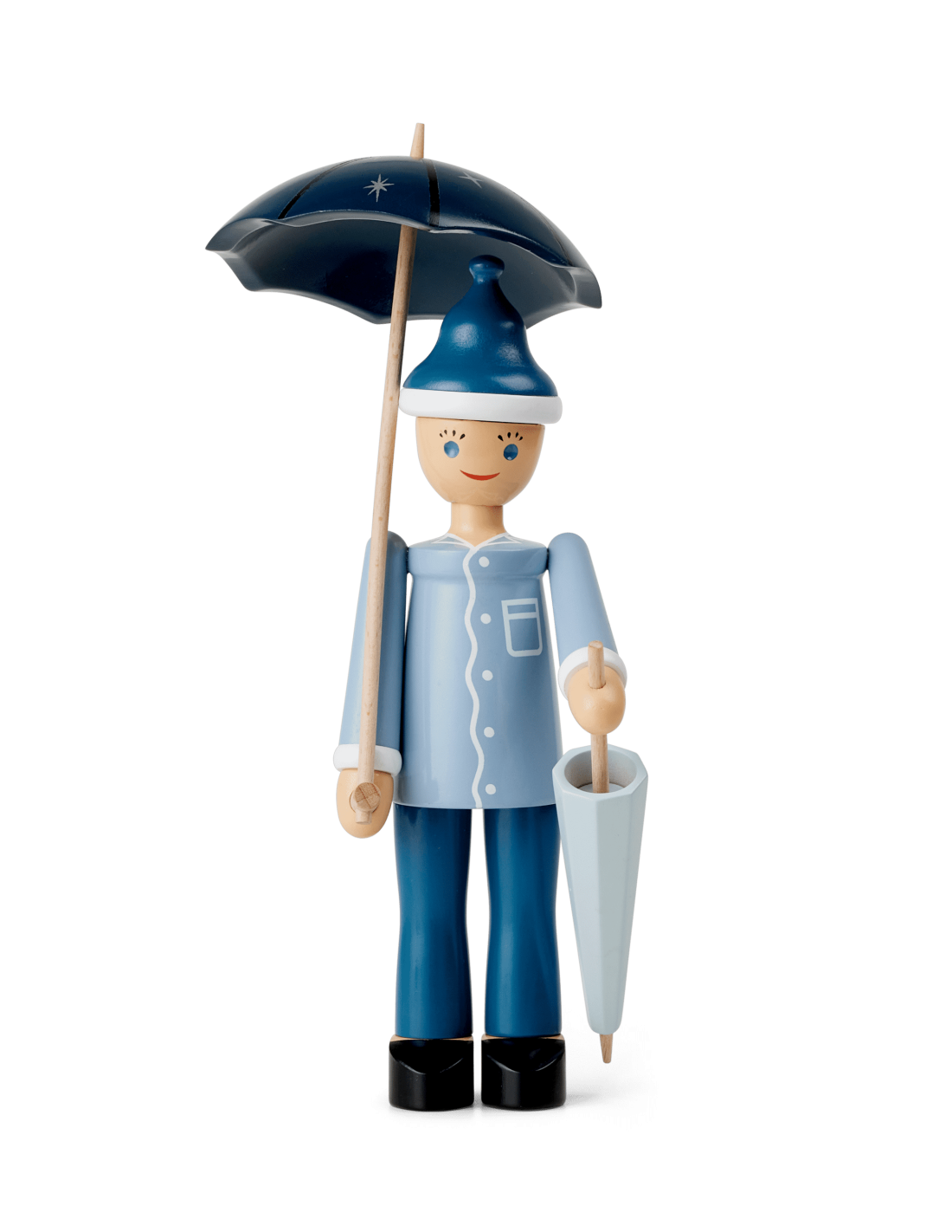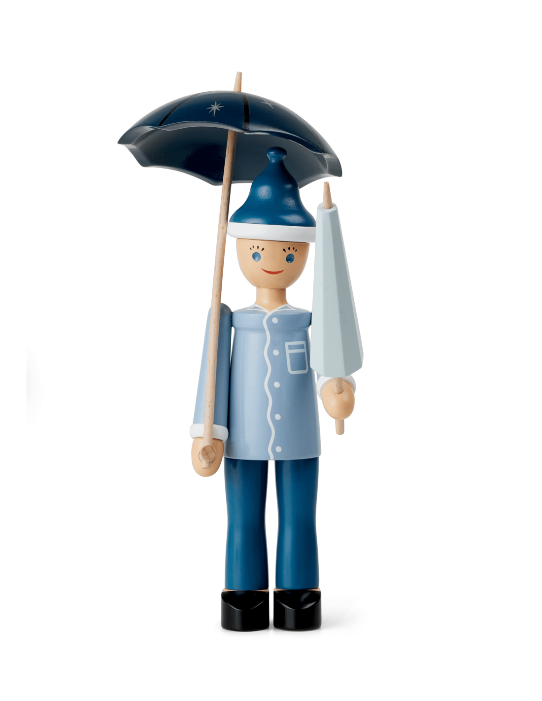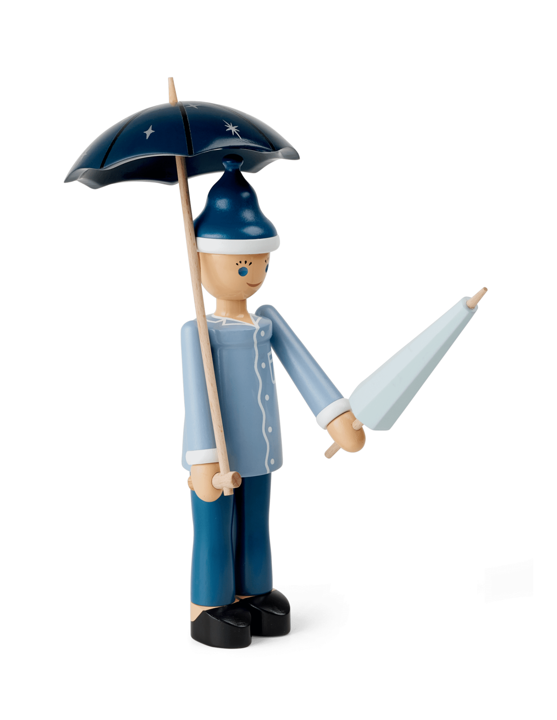 Nattergalen, Hyrdinden og Skorstensfejeren er allerede på hylderne i museumsbutikken i Odense og på rosendahl.com, og de får nu selskab af Ole Lukøje, som du også vil kunne finde i din lokale designbutik. Iført lyseblå natskjorte, mørkeblå natbukser, tøfler og en lille hue står Ole Lukøje glad og smilende med sine to paraplyer. Farverne er rolige og holdt i kølige nuancer af blå. Ole Lukøje er drejet i FSC®-certificeret bøgetræ, og den manuelle produktion med maling og tryk er udført med den store præcision og omhyggelighed, der kendetegner træfigurerne fra Kay Bojesen. Formen er baseret på de originale Ole-figurer fra Kay Bojesens arkiv, der er enkel og minimalistisk, men fuld af liv og sjæl – så Ole Lukøje får den følelse af magi og eventyr, der er i tråd med Kay Bojesens ånd og den historiefortælling, han formåede at skabe, når han designede sine fantasifulde figurer. Vær opmærksom på, at Ole Lukøje er ikke skabt med justerbare dele som arme eller ben. Vi opfordrer derfor til, at paraplyen monteres med forsigtighed, og at begge paraplyer monteres for at opnå den optimale balance.