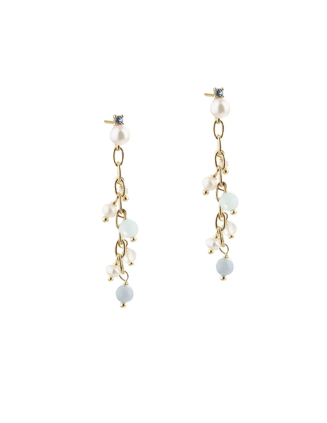 Ørestikker i forgyldt sterling sølv med kæde, hvide ferskvandsperler og blå zirkonia.