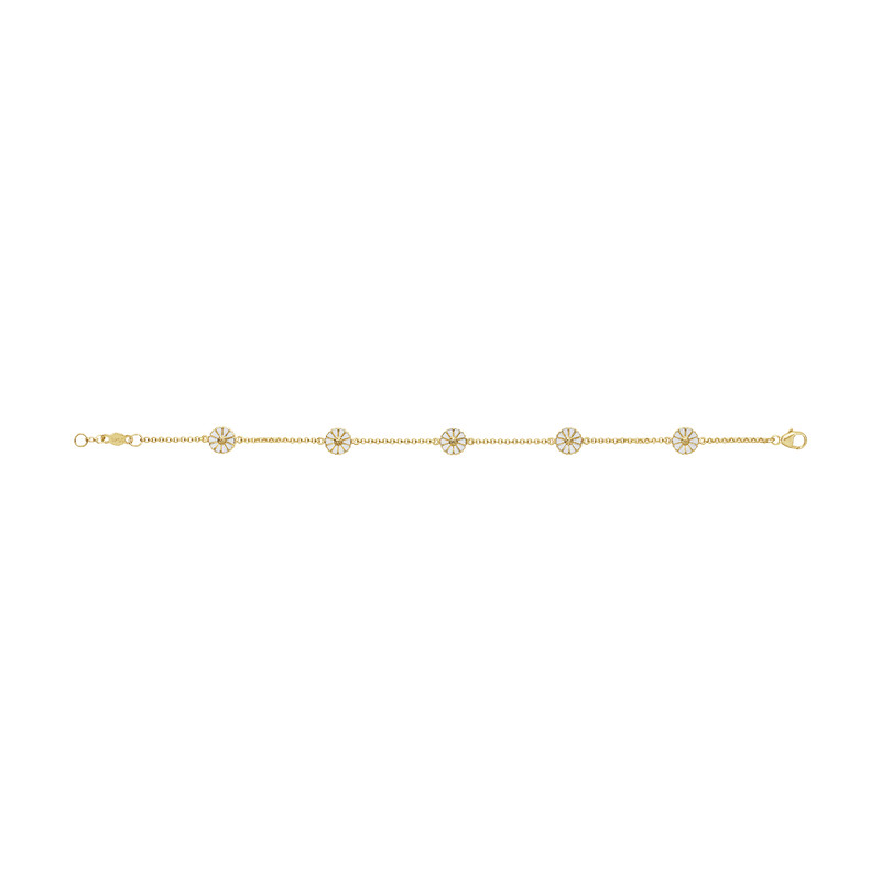 Klassisk og tidløs Georg Jensen kæde fra Daisy kollektionen. Marguerit blomsten er udført i sterling sølv, belagt med 18 kt, guld og med hvid emalje. Margueritten måler Ø 18 mm, og sidder på en forgyldt ankerkæde i 45 cm.