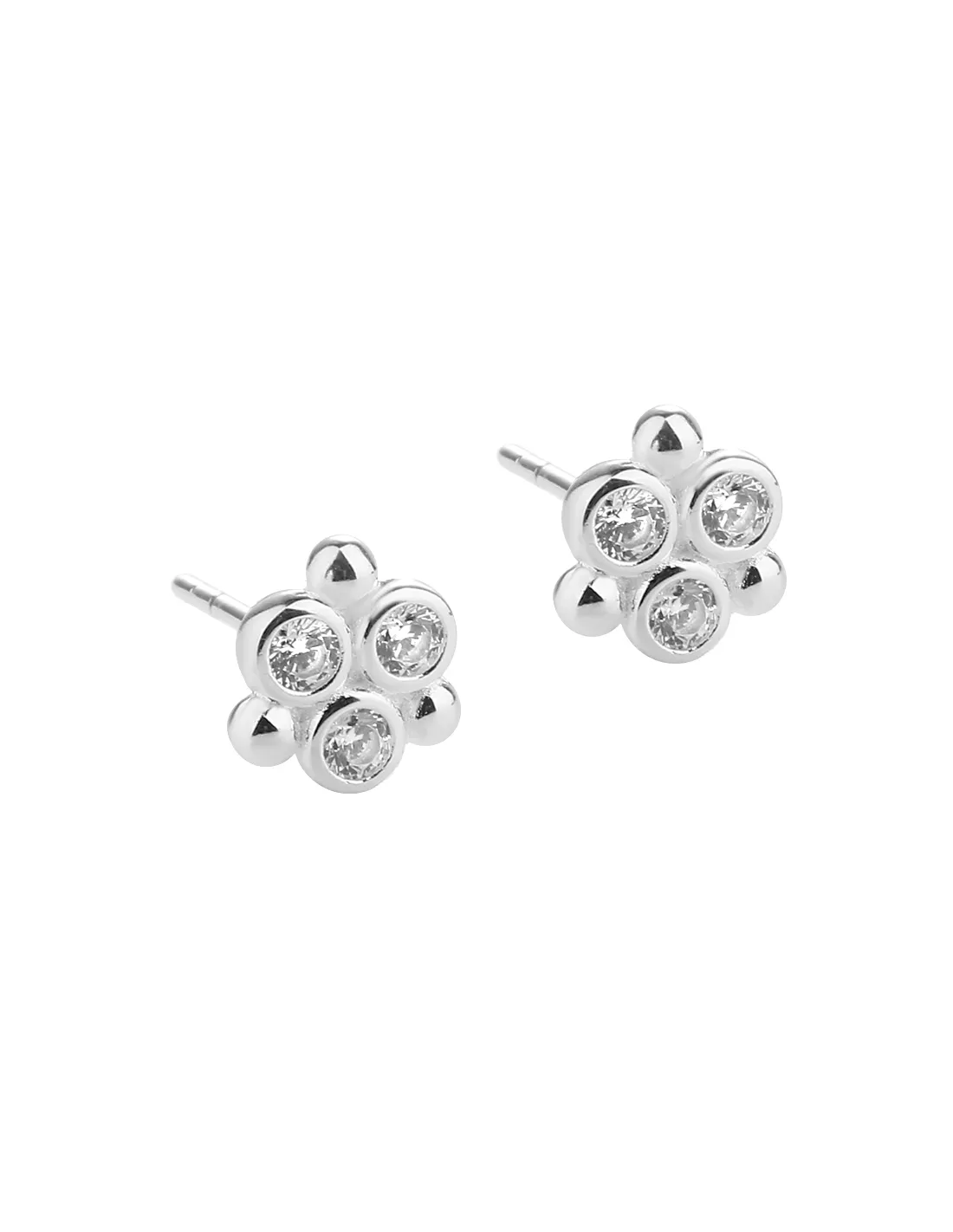 Ørestikker i sterling sølv med små kugler og klare zirkonia. 7*7 mm.