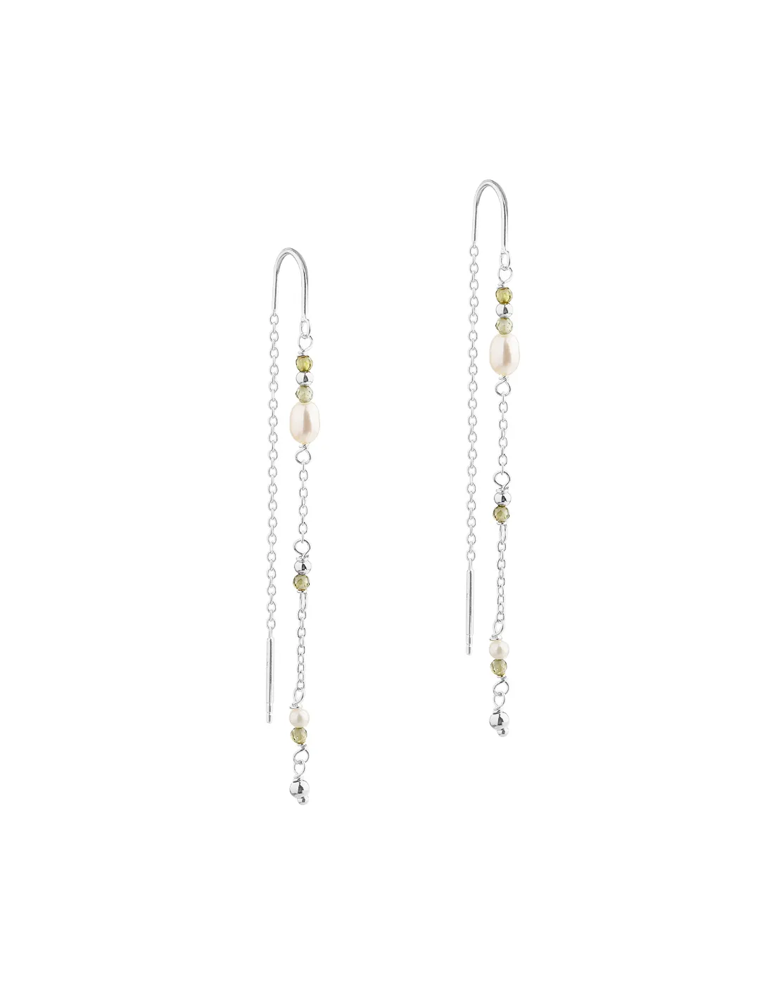 Øretråde i sterling sølv med hvide ovale ferskvandsperler, små oliven perler & sølvkugler.