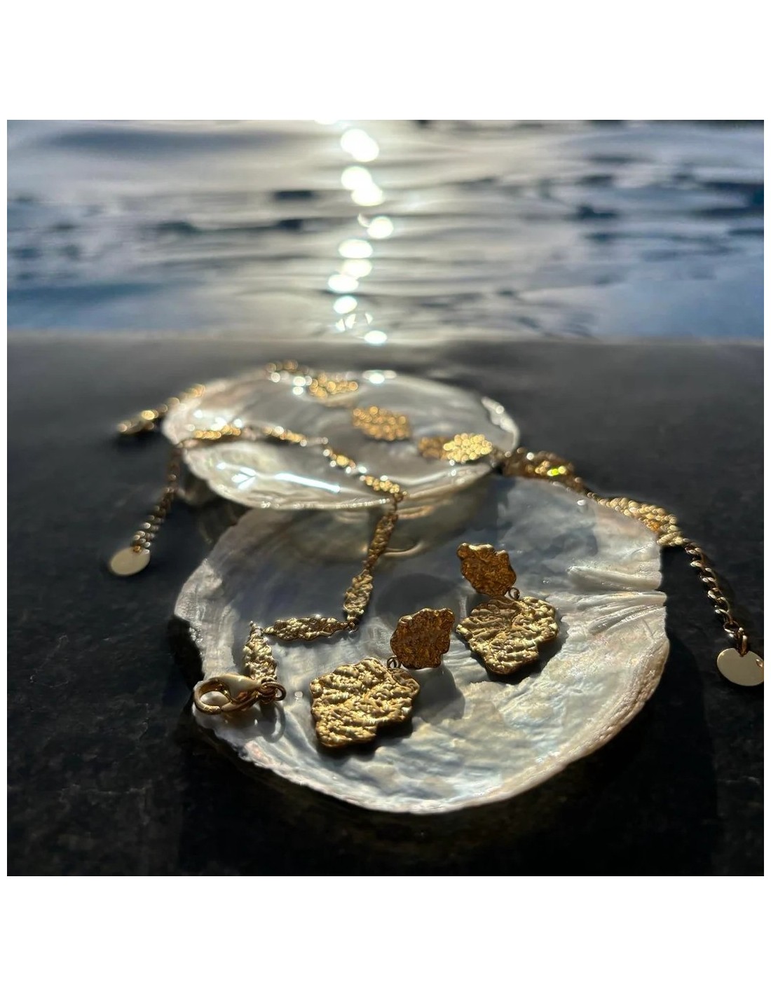 Alle smykker er lavet i genanvendt stainless steel og belagt med ekstra holdbar PVD-coating, som sikrer lang levetid – også i vand. De tåler både klor, saltvand og daglig brug uden at miste glans.
