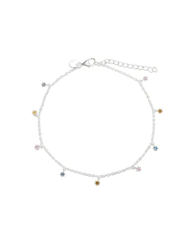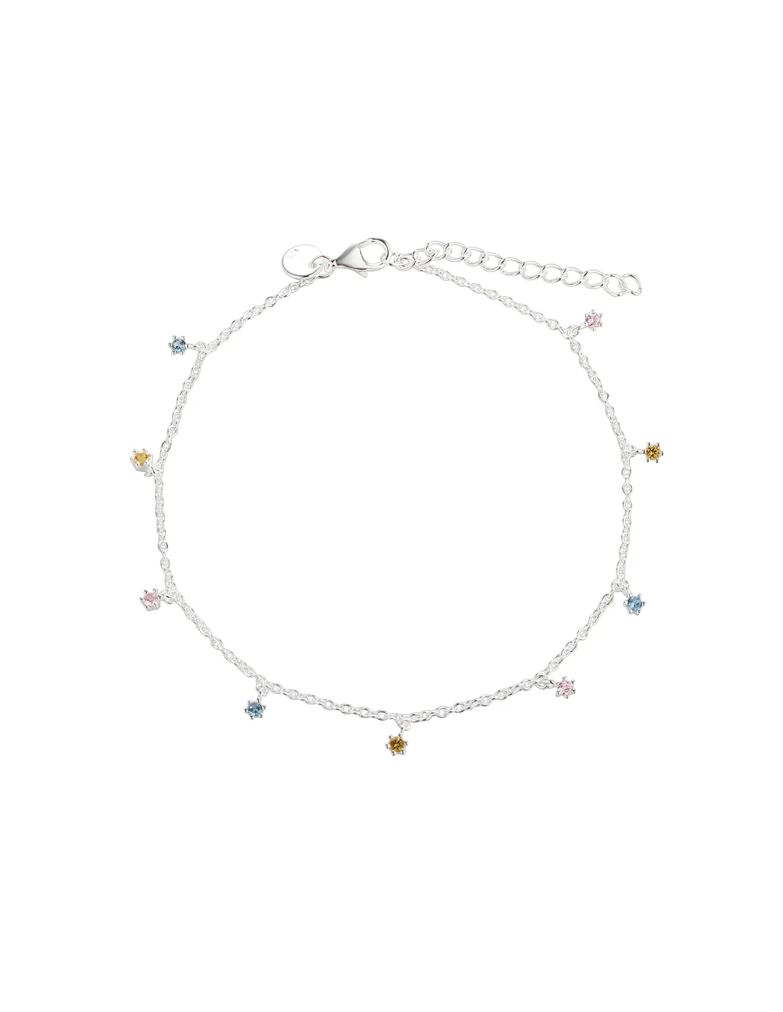 Ankelkæde i sterling sølv med små zirkonia vedhæng i rosa, gul & lyseblå.