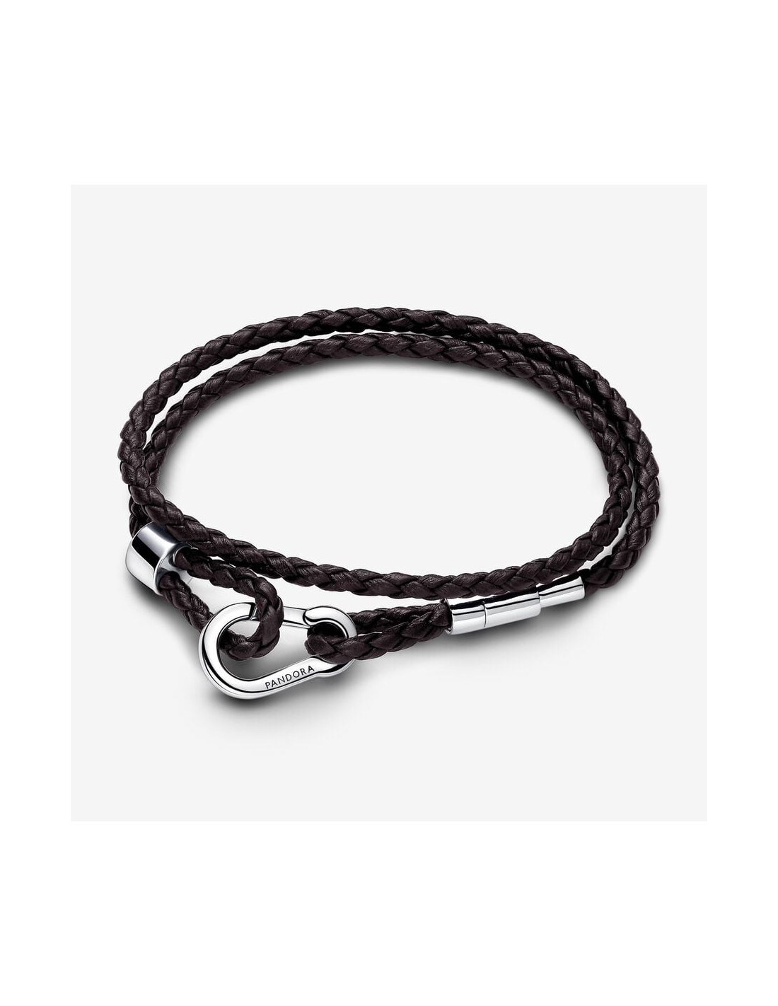 Jordfarver møder kant i Pandora Moments brune flettede dobbelte læderarmbånd. Det flettede brune læder vikles to gange og lukkes med en karabinhage i sterlingsølv, der har et indgraveret Pandora logo på begge sider.. Juster armbåndet ved hjælp af en glidende metalhætte i den ene ende af armbåndet, og sæt sikkert charms på ved hjælp af en metalhætte, der kan åbnes, i den anden ende. Gør dette moderne, superbærbare armbånd personligt med op til 16-18 charms eller charms med vedhæng.