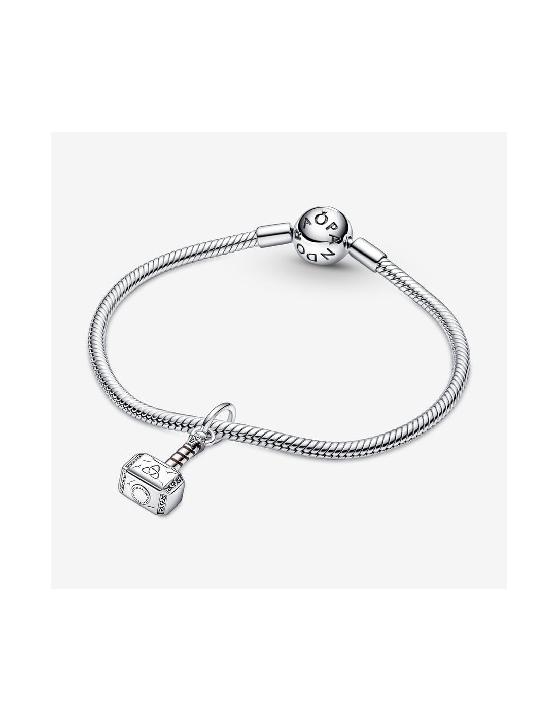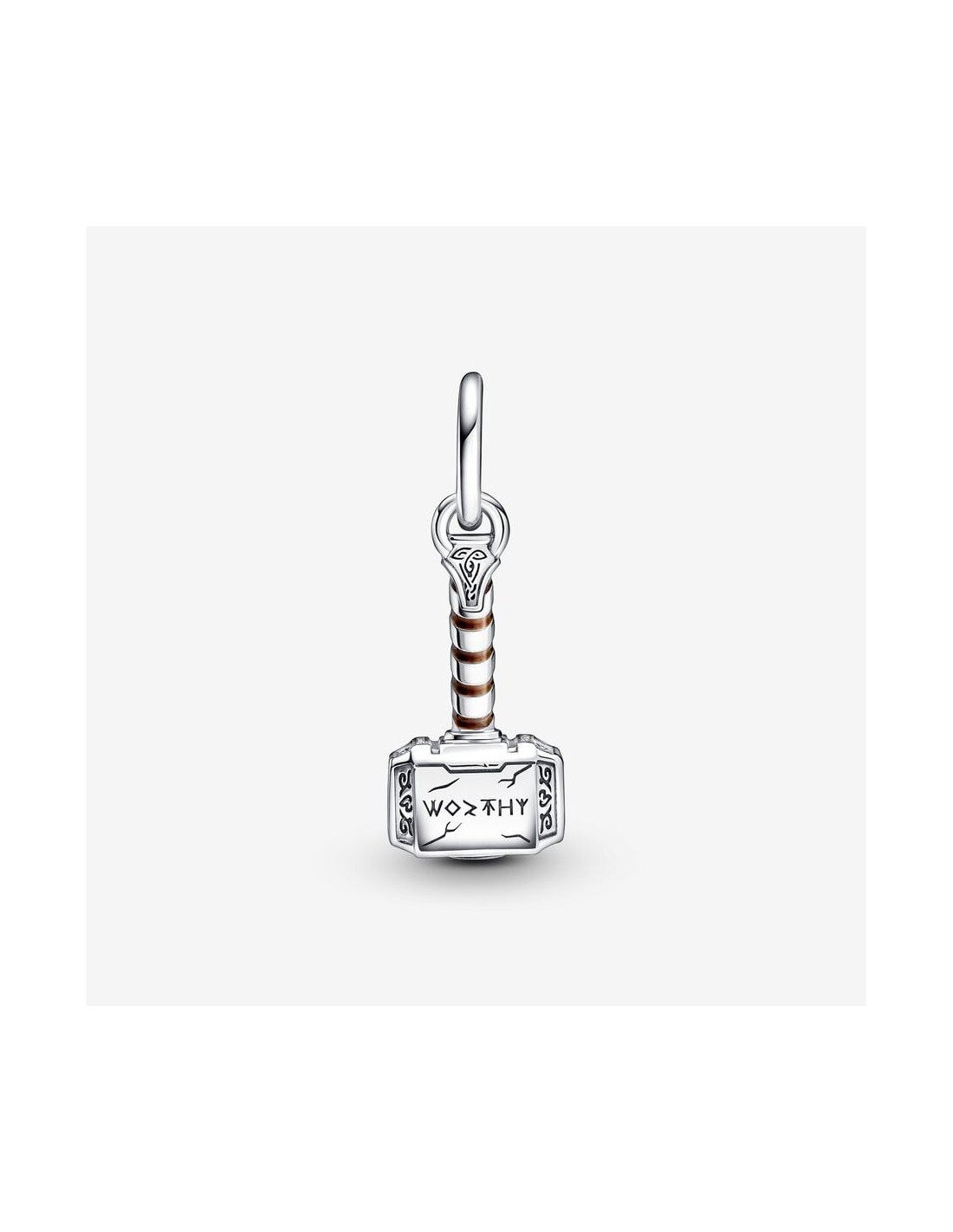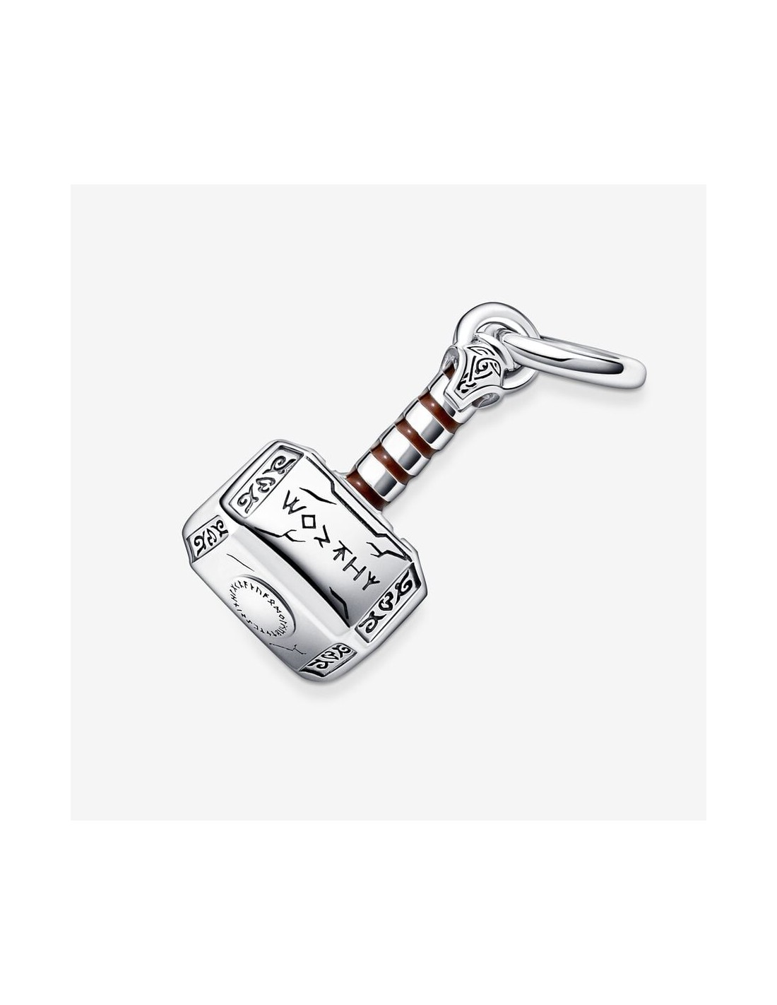 Med vores charm med vedhæng bestående af Thors Hammer fra Marvel The Avengers kan du tage tordenvejret med dig og dele din kærlighed til Marvels filmunivers med resten af verden. Thors hammer er håndforarbejdet i sterlingsølv og vækkes til live med hvirvlende brun emalje, indgraverede ridsemærker og runesymboler i asgariansk stil. Siden af hammeren er indgraveret med ordet "Worthy" som en påmindelse om Thors kraft. Sæt dette charm og flere af dine yndlingshelte på vores Pandora Moments Slangekædearmbånd med Marvel The Avengers logolås.