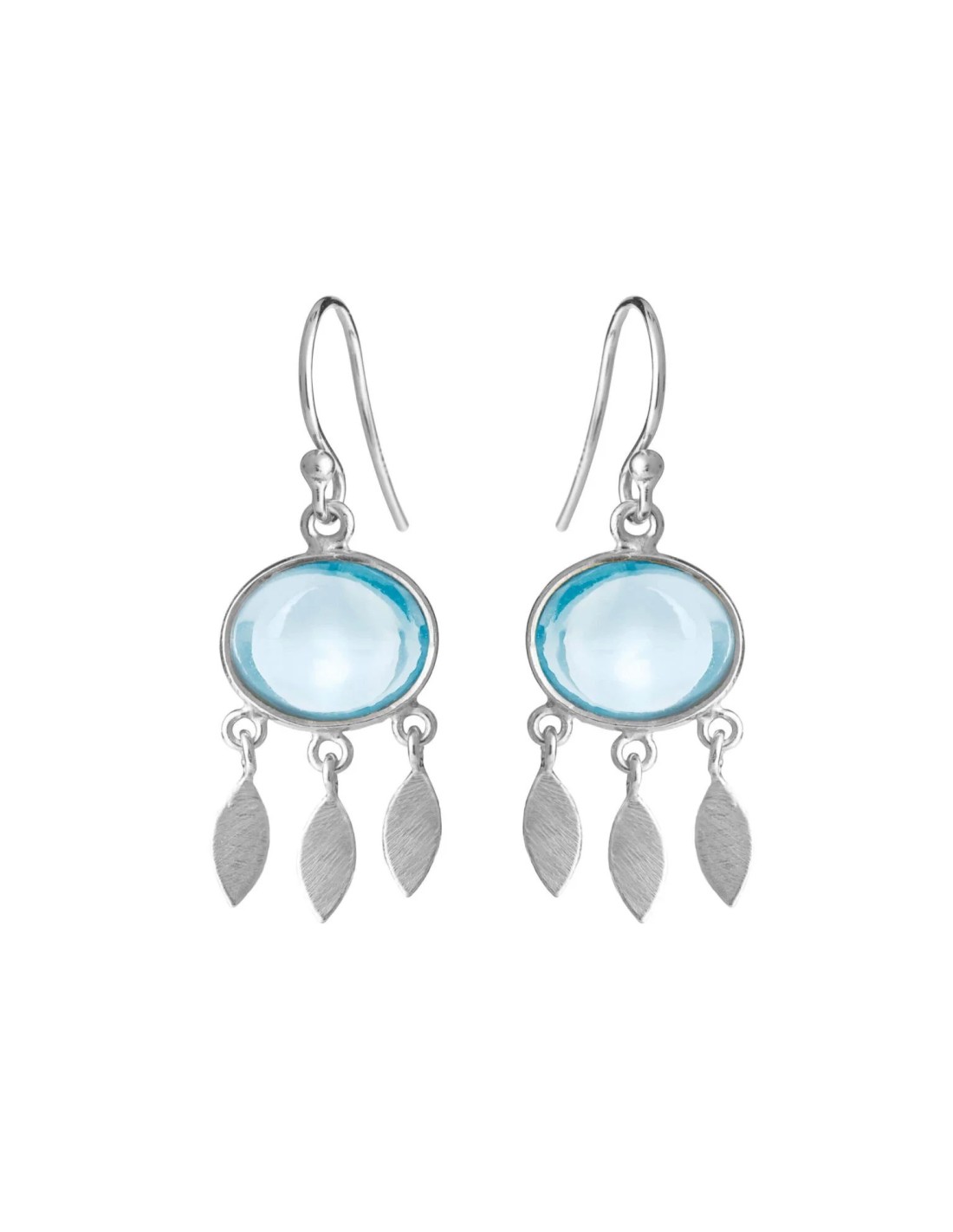 Dingleøreringe (kroge), sølv, syntetisk blå topas oval cabochon 10×12 mm med små blade, ca. 3,5 cm lange.