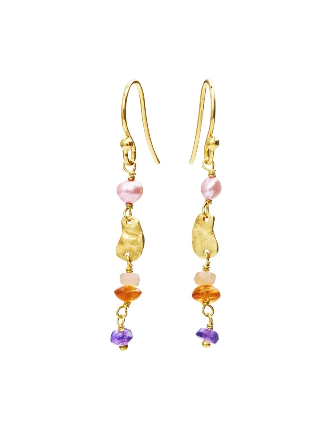 Dingleøreringe (kroge), forgyldt sølv, amorfperle, ametyst, farvede ferskvandsperler, karneol, ferskenfarvet månesten ca. 4 cm.
