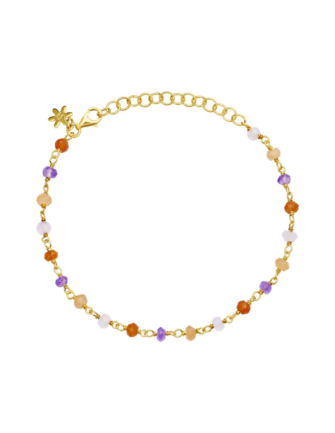 Armbånd 16-20 cm, forgyldt sølv, knyttet 3-4 mm facetsleben ametyst, karneol, ferskenfarvet månesten, rosakvarts.