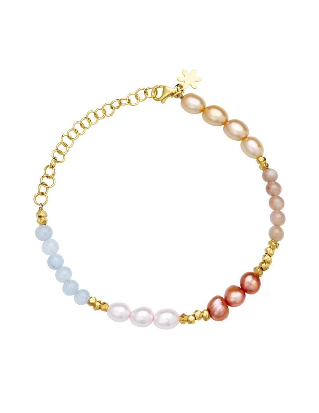 Armbånd 16-20 cm, forgyldt sølv, facetslebne perler, akvamarin, ferskenfarvet månesten, farvede ferskvandsperler.