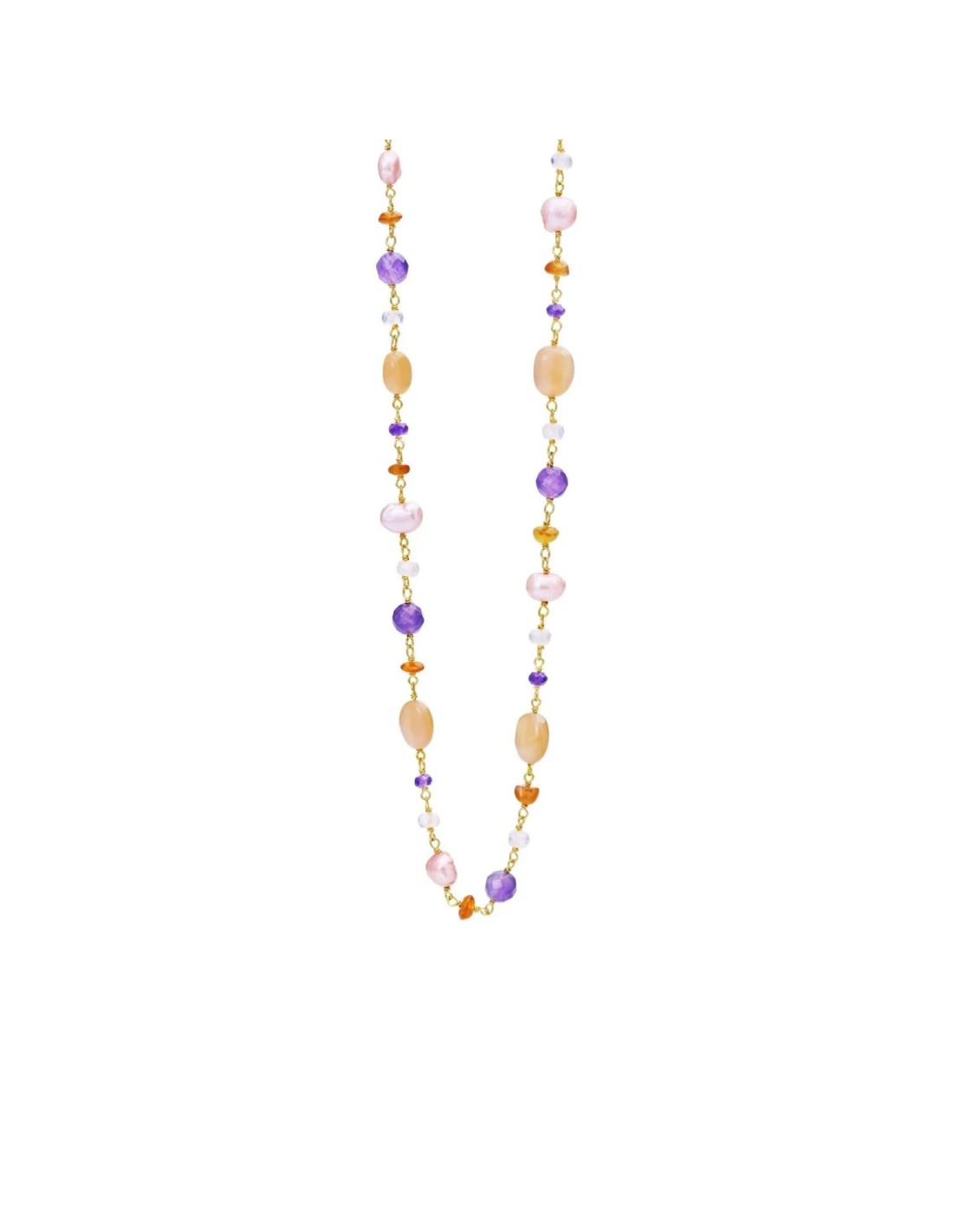 Halskæde 40-45 cm, forgyldt sølv, knyttet med ametyst, farvede ferskvandsperler, karneol, ferskenfarvet månesten, rosenkvarts.