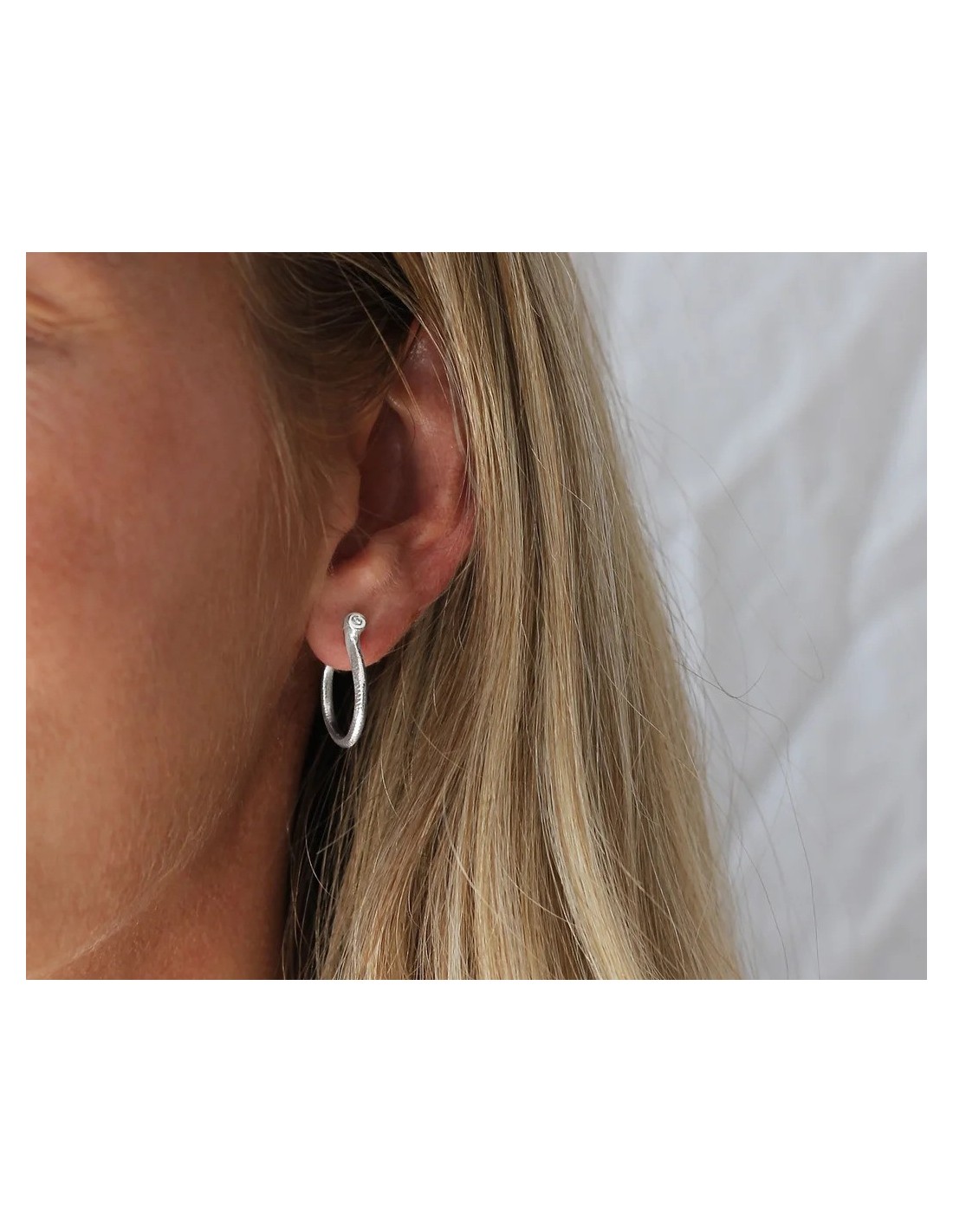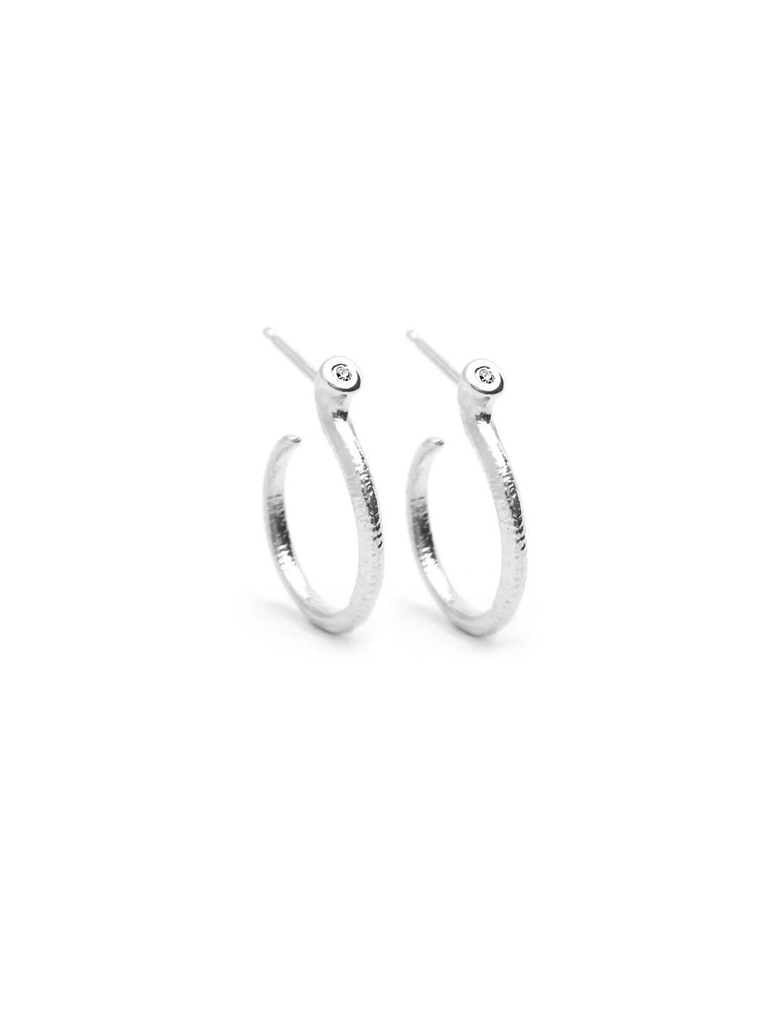 De smukke Ophelia creoler lavet i sølv har en ru overflade og deres enkle udtryk passer perfekt til et hverdagslook. I hver creol er der isat en 0,01 ct. TW / VS diamant, hvilket giver øreringene en total på 0,02 ct. TW / VS diamanter i alt.