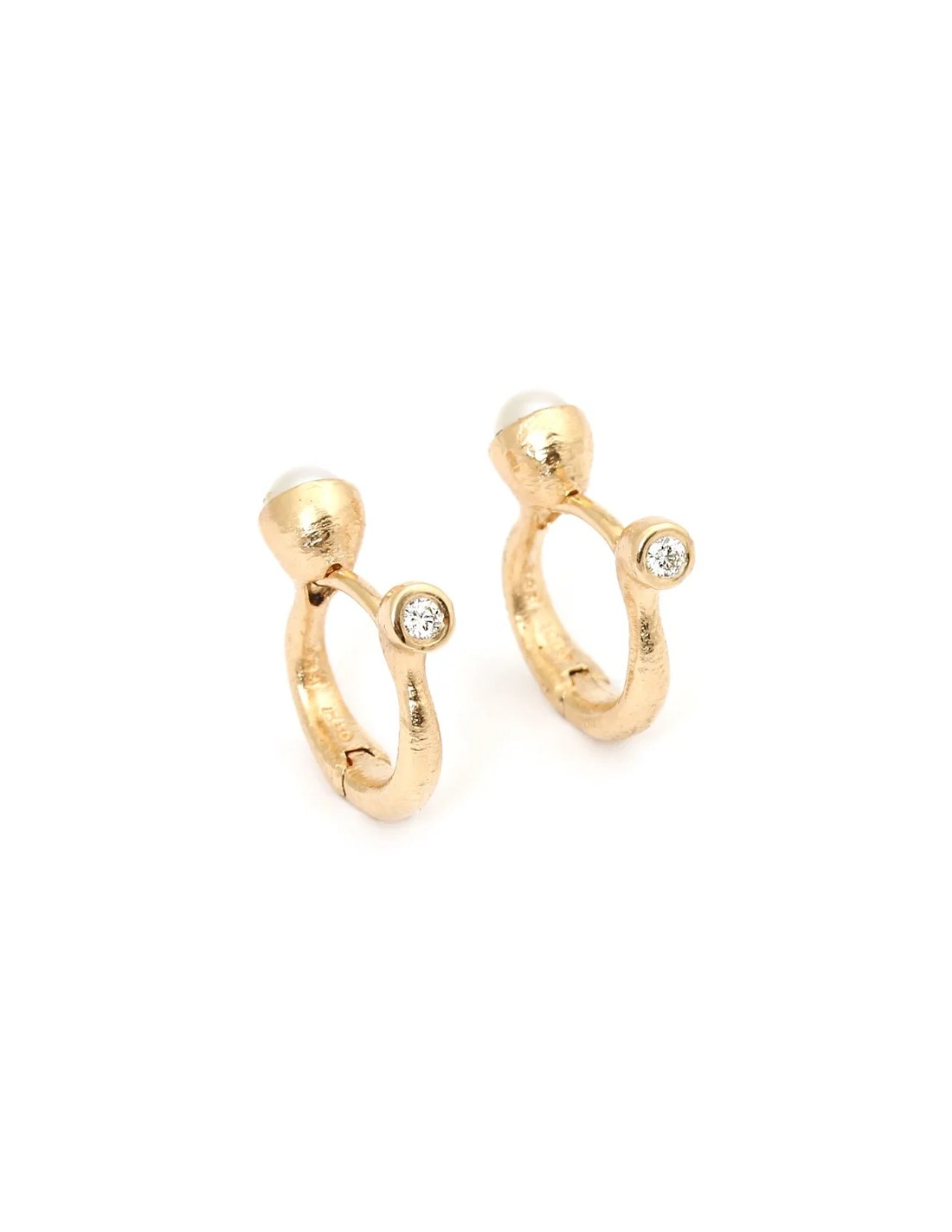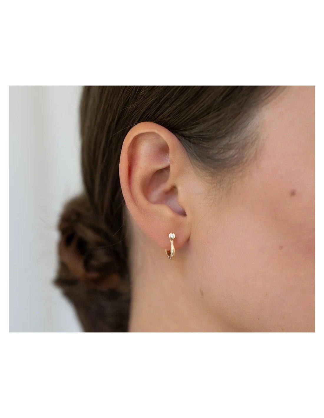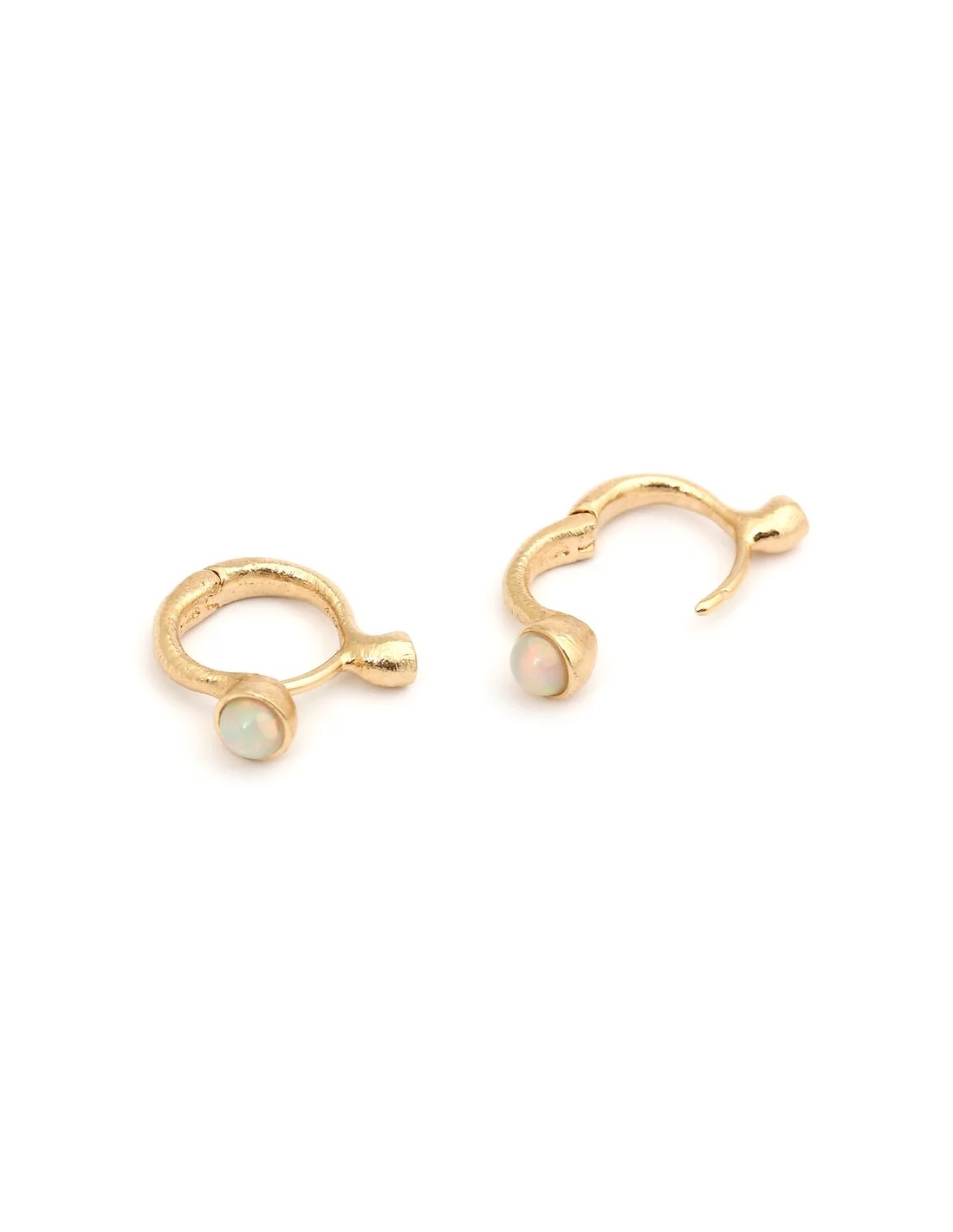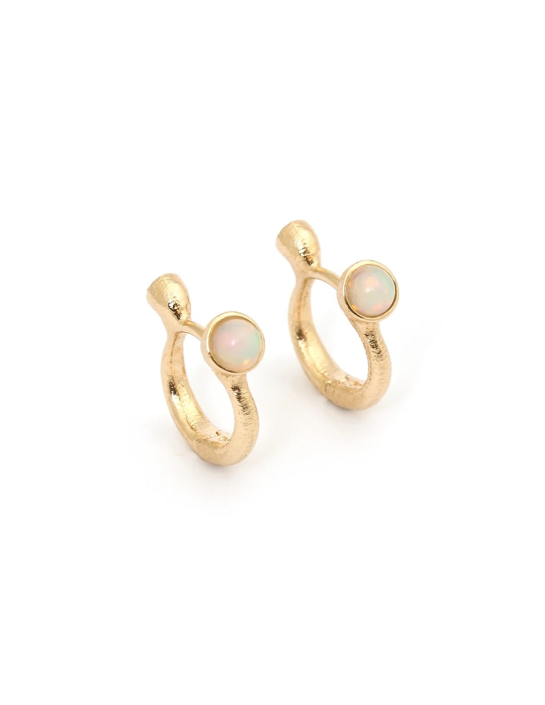 De nye smukke vendbare Ophelia creoler lavet i 14 kt. guld har en rustik overflade og deres enkle udtryk passer perfekt til ethvert outfit. Creolerne kan sættes i øret fra begge veje, og har en 0,03 ct. TW / VS i sat i den ene side og en classic opal i den anden. Øreringene har dermed to forskelige looks afhængig af hvordan du vender dem og i alt 0,06 ct. diamanter.