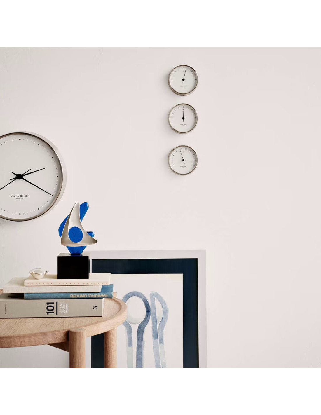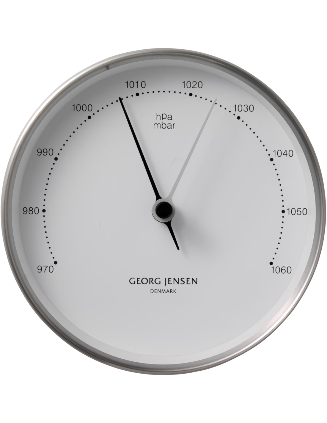 Designet er et ægte eksempel på skandinavisk minimalisme, og barometeret kombinerer funktionalitet med rene linjer og et virkelig gennemført look. Mekanikken sikrer nøjagtige målinger af atmosfærisk tryk og viser resultatet med uhørt præcision, så form og funktion går op i en højere enhed. Henning Koppel er en af Georg Jensens kendteste og mest berømte designere. Gennem en stor del af det 20. århundrede skabte han nogle af virksomhedens mest ikoniske produkter, fra sølvtøj og smykker til ure og bestik.