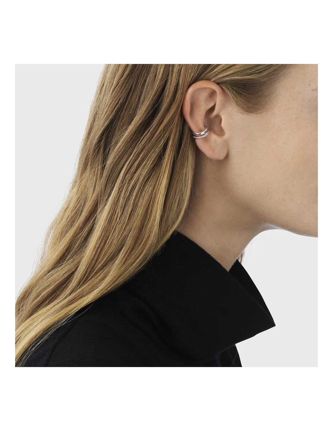 FUSION øreringen i 18 karat hvidguld med pavéindfattede, brillantslebne diamanter er bygget op omkring et åbent design, der genskaber kollektionens ikoniske bølgede mønster. Øreringen er inspireret af Nina Koppels originale design og sælges som et enkelt smykke. Den kan nemt sættes på øret og kræver ikke hul.