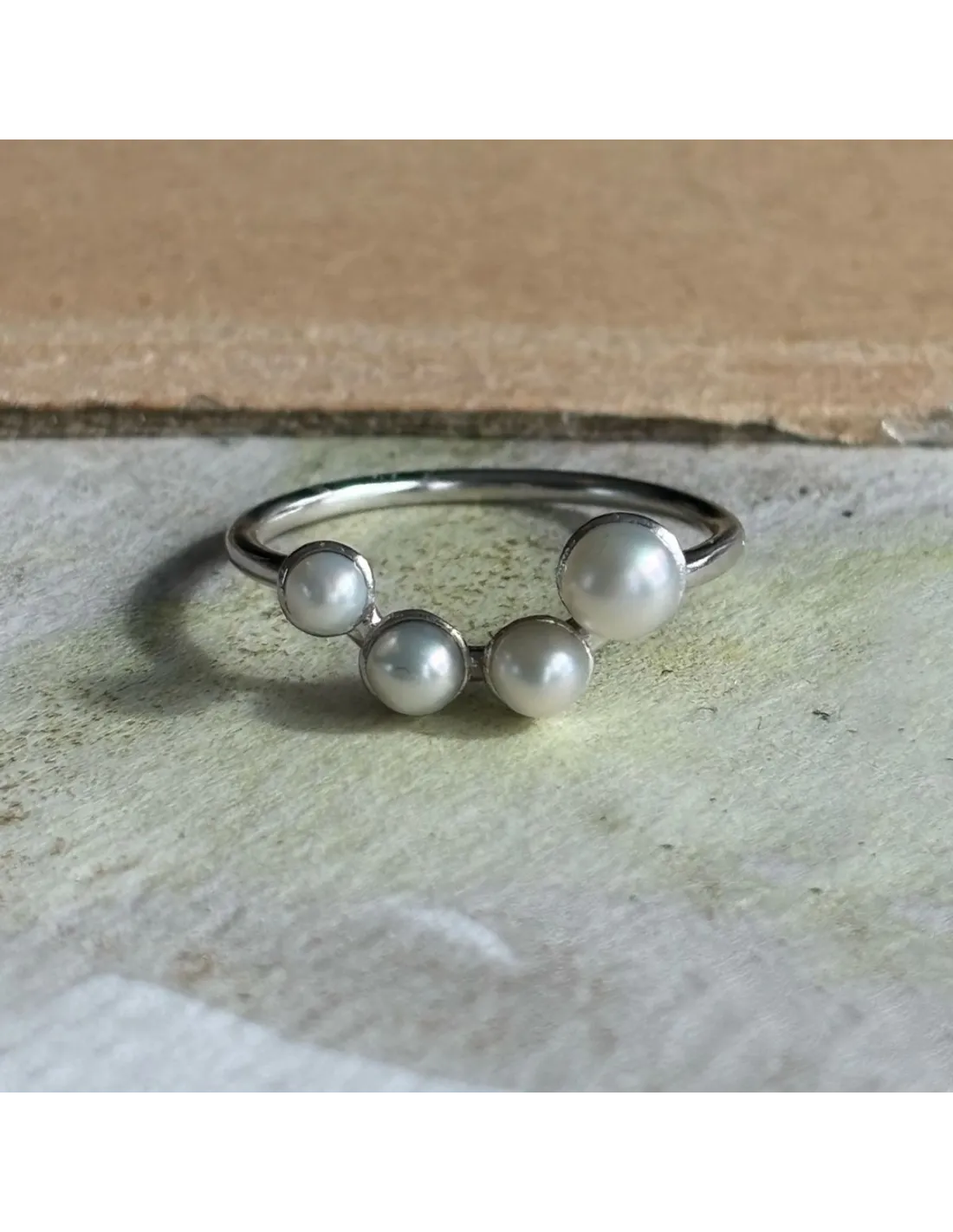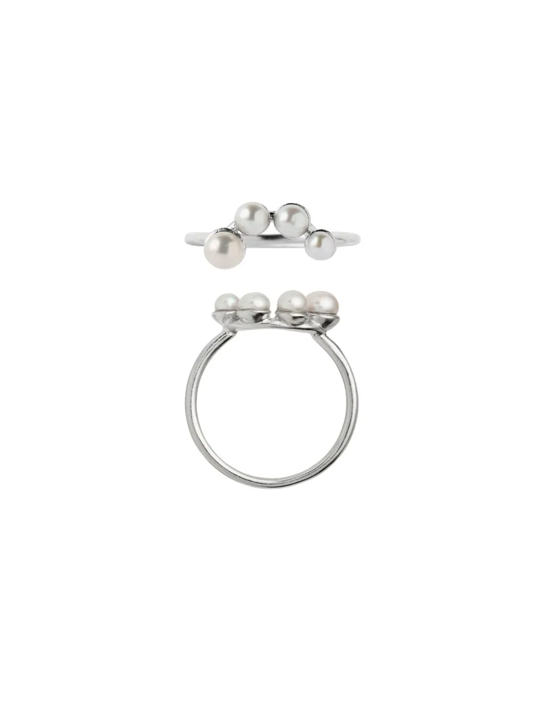 Denne sølvring fra Stine A prydes af fire hvide ferskvandsperler, der er placeret i en let bølgende linje. Det luftige design skaber et levende udtryk, hvor de naturlige perlers bløde glans møder det kølige sølv – ideel til dig, der ønsker et stilrent og iøjnefaldende smykke.