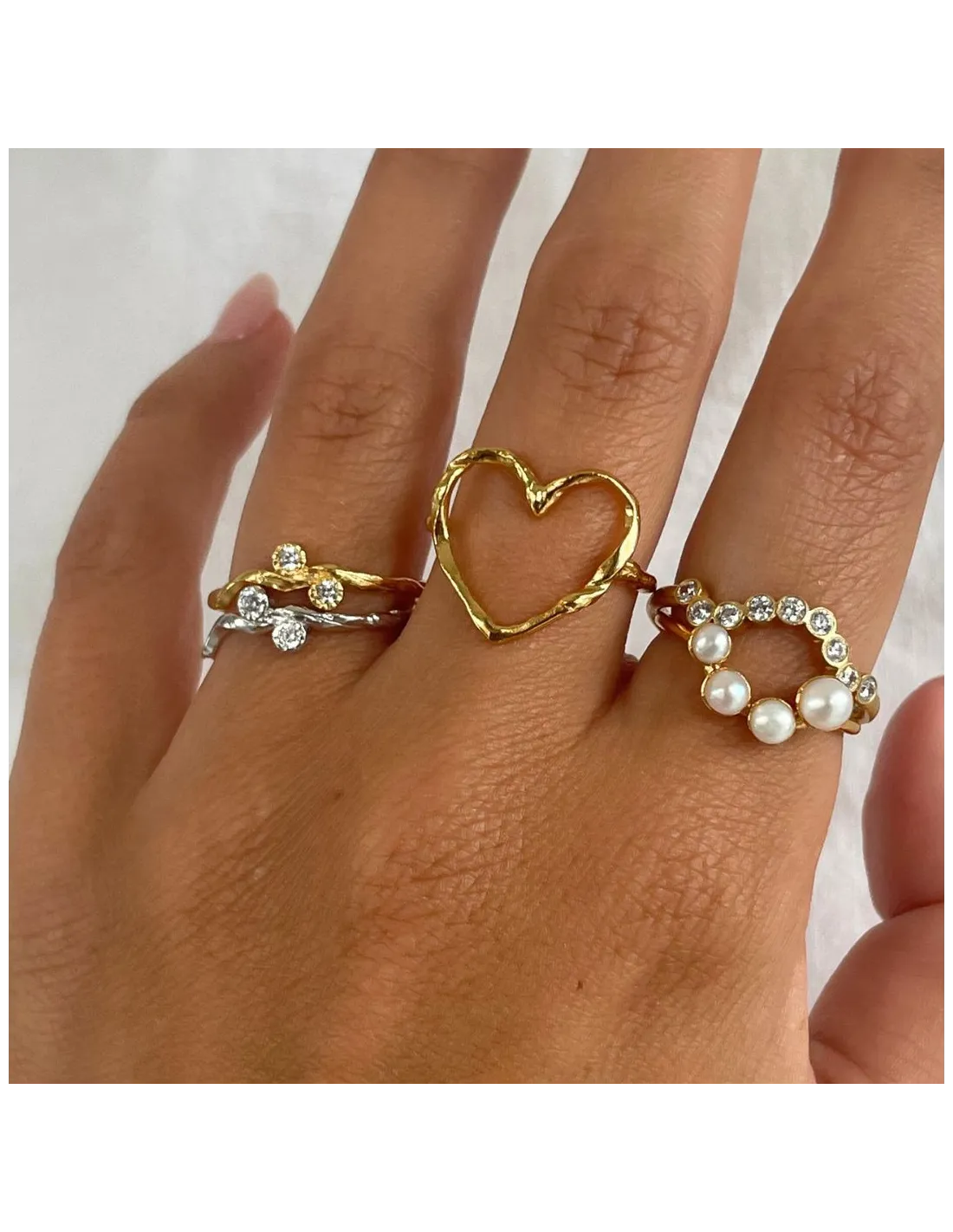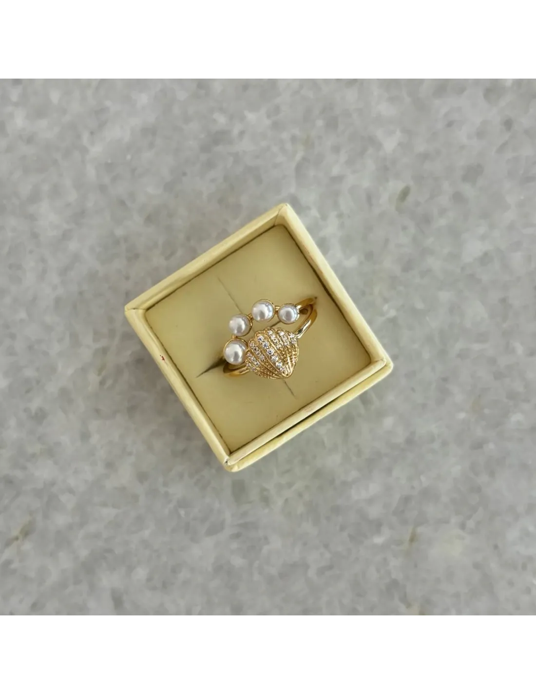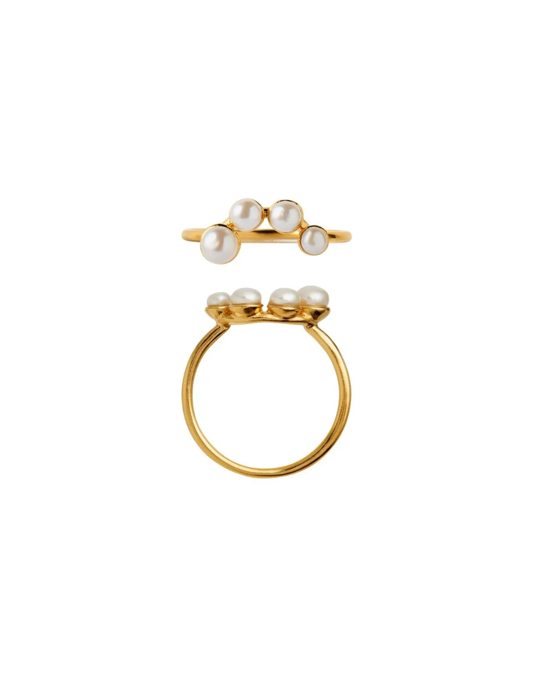 Denne fingerring fra Stine A kombinerer forgyldt finish med smukke ferskvandsperler i et balanceret og moderne design. De organiske perler ligger side om side i en let forhøjet fatning, der løfter udtrykket og giver ringen visuel fylde uden at virke tung.