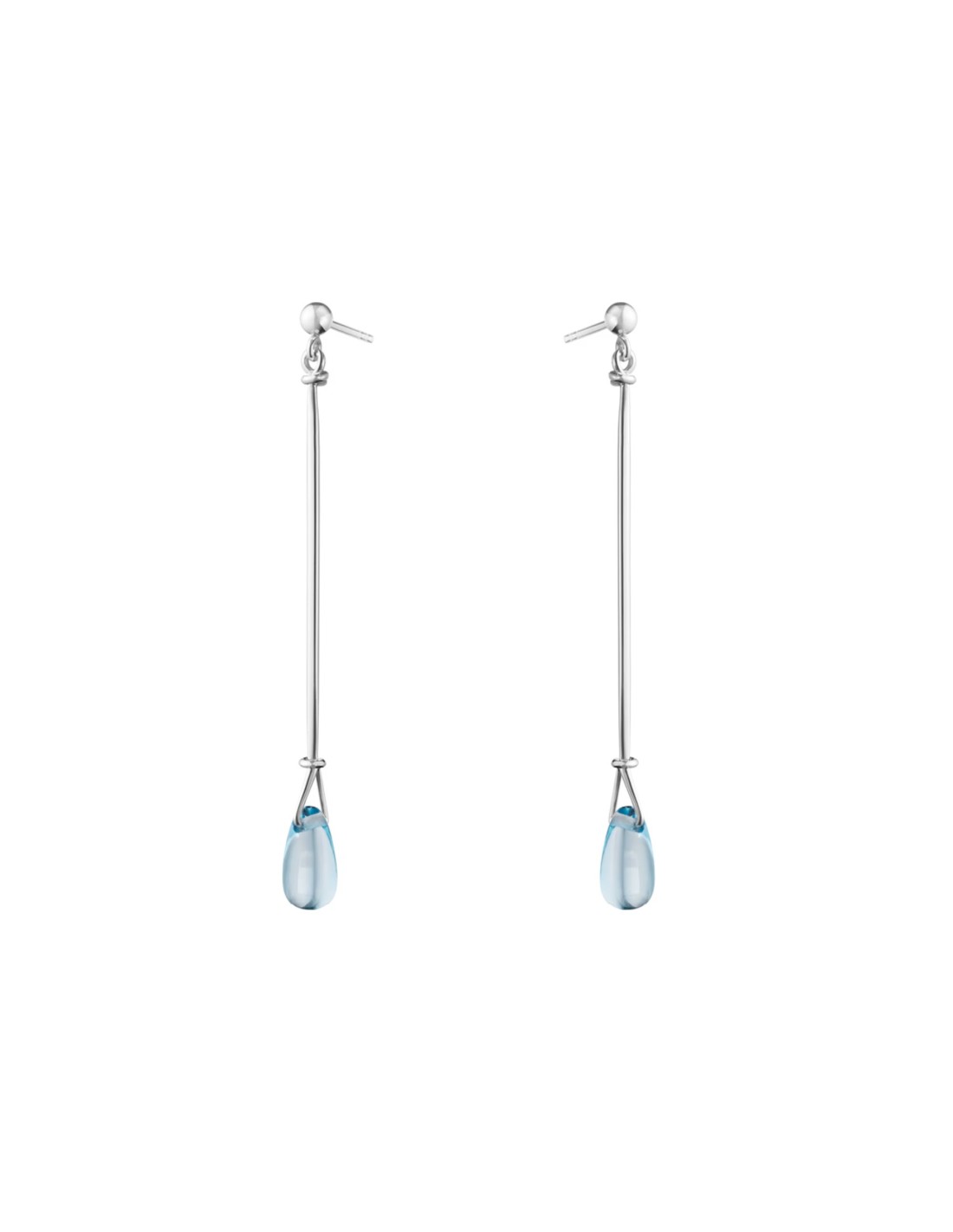 Den svenske designer Vivianna Torun var en af det 20. århundredes mest berømte sølvsmede, kendt for at hente inspiration i naturens verden og skabe smykker, som rummer en naturlig følelse af elegance. Disse øreringe har et dråbeformet vedhæng i blå topas, som hænger i en enkel sølvtråd og er et smukt eksempel på hendes tilgang til design. Øreringene er fra en særudgave-kollektion, som genudgiver nogle af de mest imponerende smykker, Vivianna Torun designede for Georg Jensen.