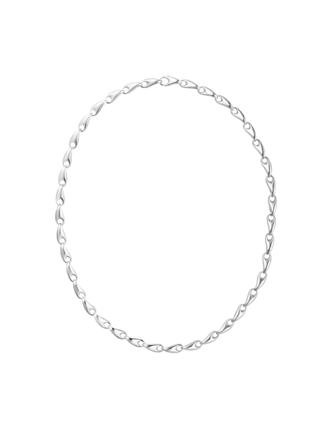 Denne elegante sølvhalskæde er et nyskabende design, inspireret af klassiske kæder. Jacqueline Rabun, som er en af Georg Jensens tætte samarbejdspartnere, står bag designet, hvor sølv-led i organiske former hægter sig sammen til et markant og skulpturelt smykke. Halskæden passer både til mænd og kvinder, og den er et flot unisex-smykke med et tidløst udtryk.