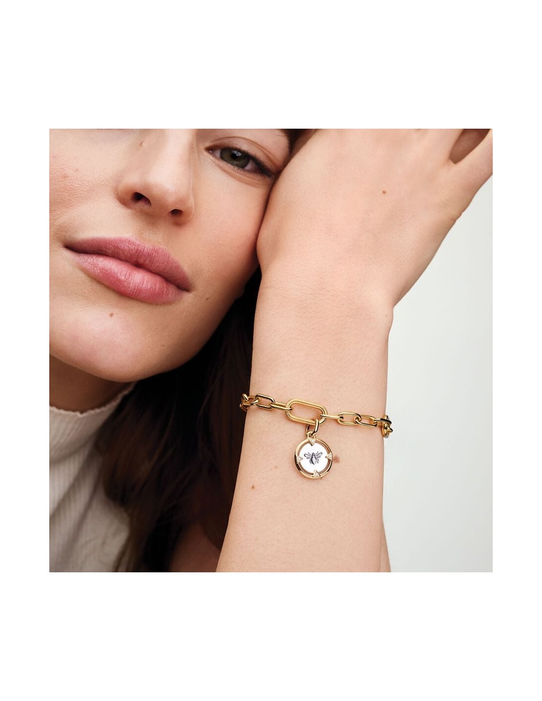 Sammensæt dine yndlingssmykker på nye måder. Vores 14 kt. guldbelagte Pandora ME Ledarmbånd giver uendeligt mange stylingmuligheder. Armbåndet har to stylingmellemled, der kan åbnes – designet med en rillet overflade, så de nemt kan genkendes – en gruppe på fire led mellem hvert stylingmellemled og en karabinlås. Start med at tilpasse armbåndets ledkæde: Fire led kan skiftes ud med ét dobbelt stylingled eller et enkelt stylingled – behold den oprindelige længde eller juster den, så den passer til dig. Når du har tilpasset ledkæden, kan du sætte op til to meningsfulde medaljoner eller op til otte minicharms med vedhæng på hvert mellemled, der kan åbnes, for at vise verden, hvem du er. Bemærk: Medaljoner, hvor den øverste del kan åbnes, kan styles på lukkede stylingled.