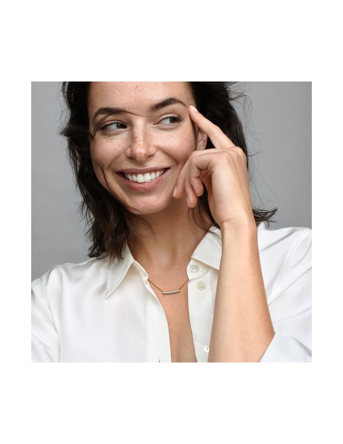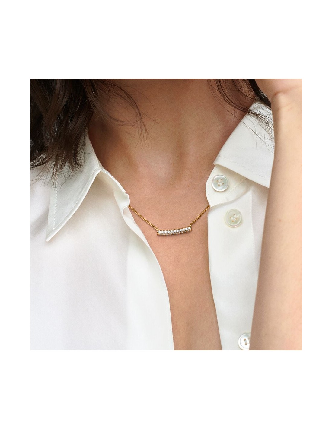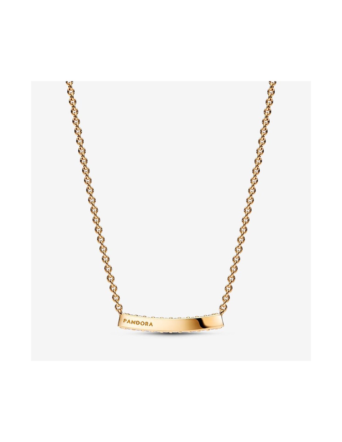 Maksimer dit potentiale for at stråle med en Pandora Timeless Pavé Enkeltradet Collier-halskæde. Det alsidige smykke har et buet vedhæng, der er fastgjort til kæden med en geometrisk finish og en enkelt række af funklende sten, der fremhæves af ekstra rækker af sten, som vender udad på hver side. Giv dit look en varm glød med vores 14 kt. guldbelagte finish, der fremhæver den tredimensionelle glans. Smykket kan justeres i to længder og kan bæres alene eller sættes sammen med andre smykker i et iøjnefaldende look.