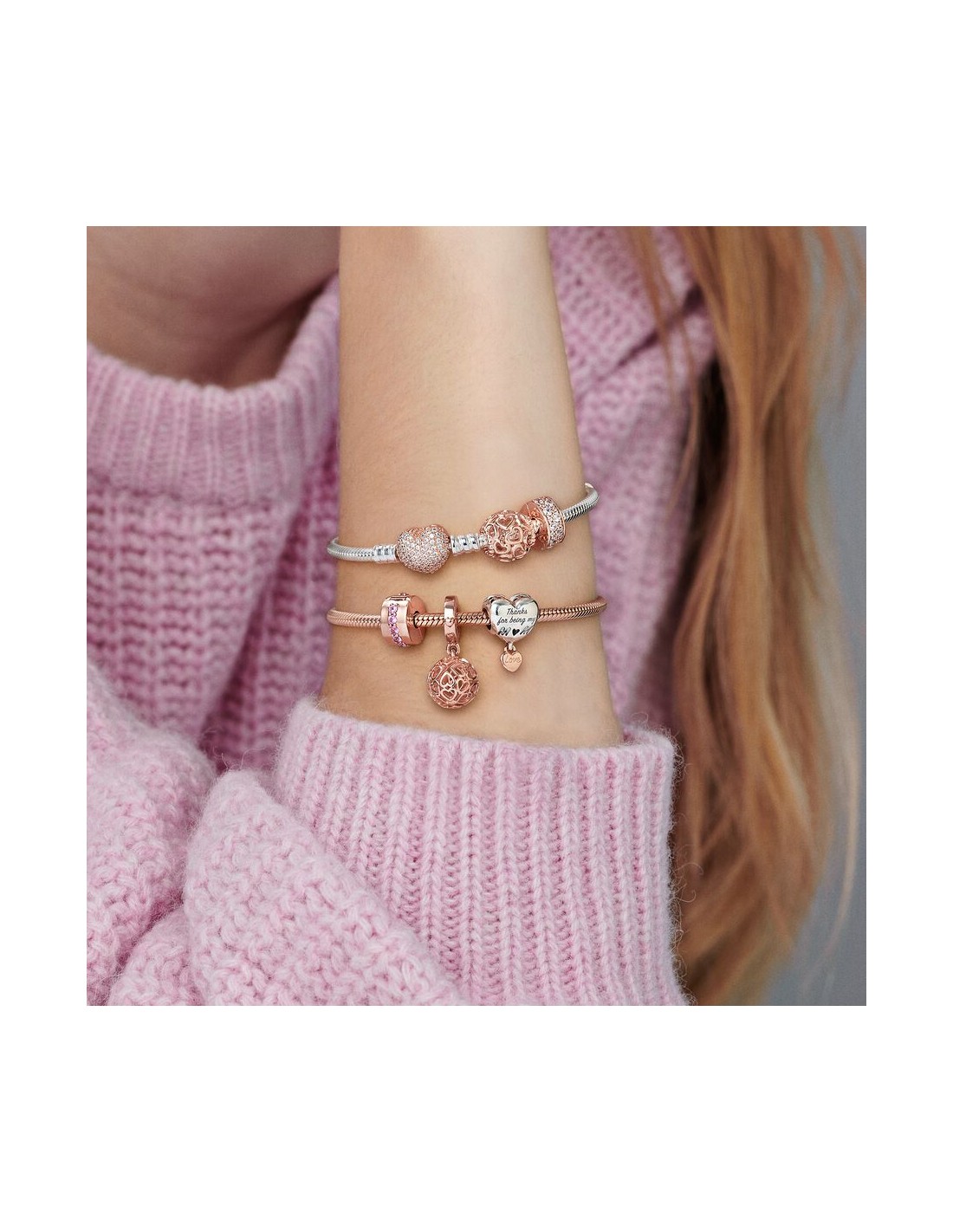 Hjerter er et klassisk symbol på kærlighed. Det udtryksfulde Hjerter Overalt Charm er smukt håndforarbejdet og belagt med 14 kt. roséguld og formet som hjerter i et åbent mønster, der giver et kig ned til det armbånd, charmet sidder på. Brug det på dit foretrukne Pandora Moments-armbånd eller -armring sammen med andre charms, der fortæller din historie. Du kan også bruge det som halskædevedhæng.