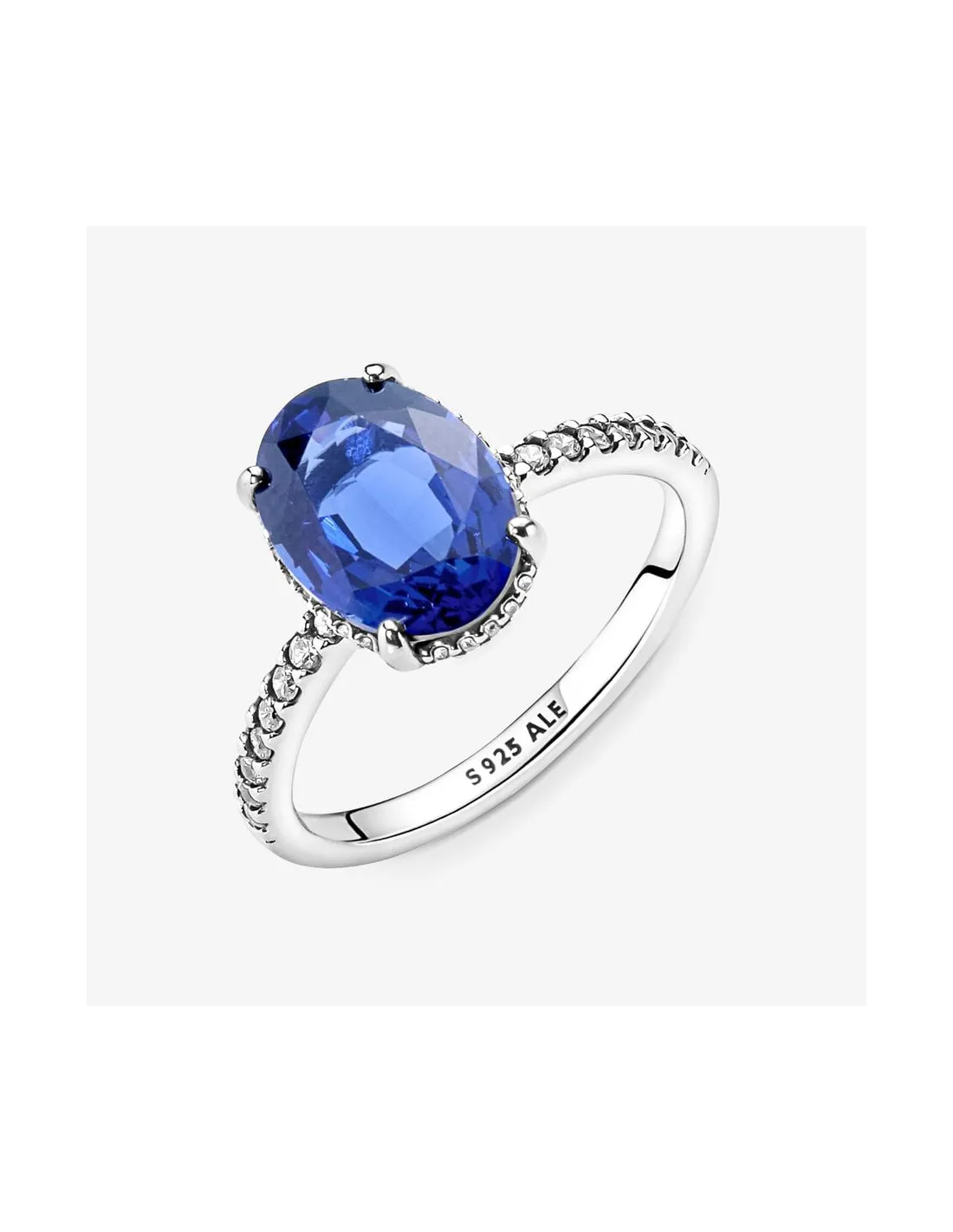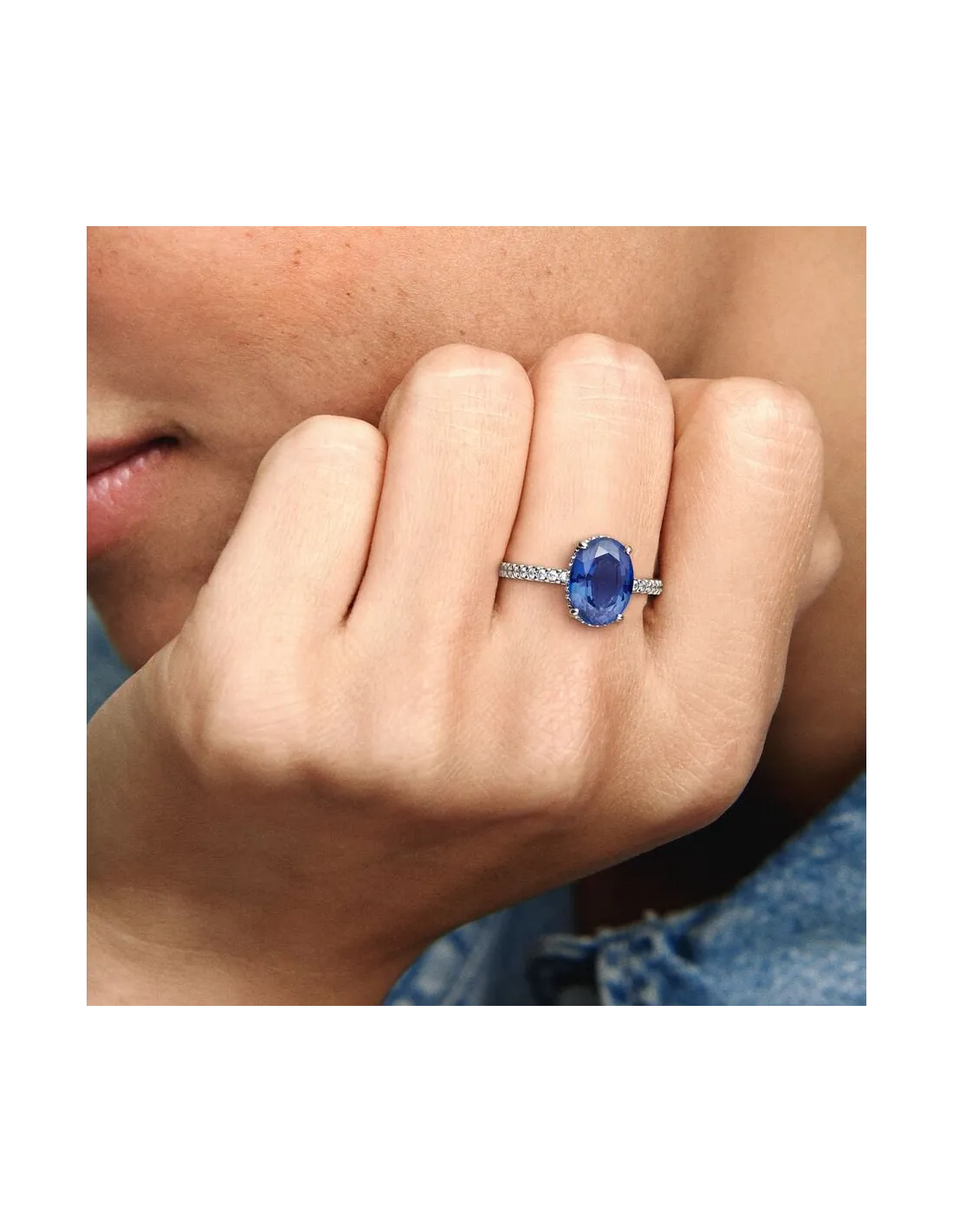 Denne Funklende Statement Halo Ring vil tilføre glamour til enhver anledning. Ringen er prydet med en smuk blå, oval syntetisk krystal, der er slebet sådan, at stenens klare farve rigtigt kommer til sin ret, når den ses fra siden, og fremhæves af en halo af strålende pavé nedenunder. Båndet er håndforarbejdet i sterlingsølv og pyntet med funklende kubisk zirkonia som en reference til traditionel smykkestil. Den fantastisk flotte ring er både smuk alene og i en stabel med andre ringe. En ring, der er skabt til at holde hele livet.
