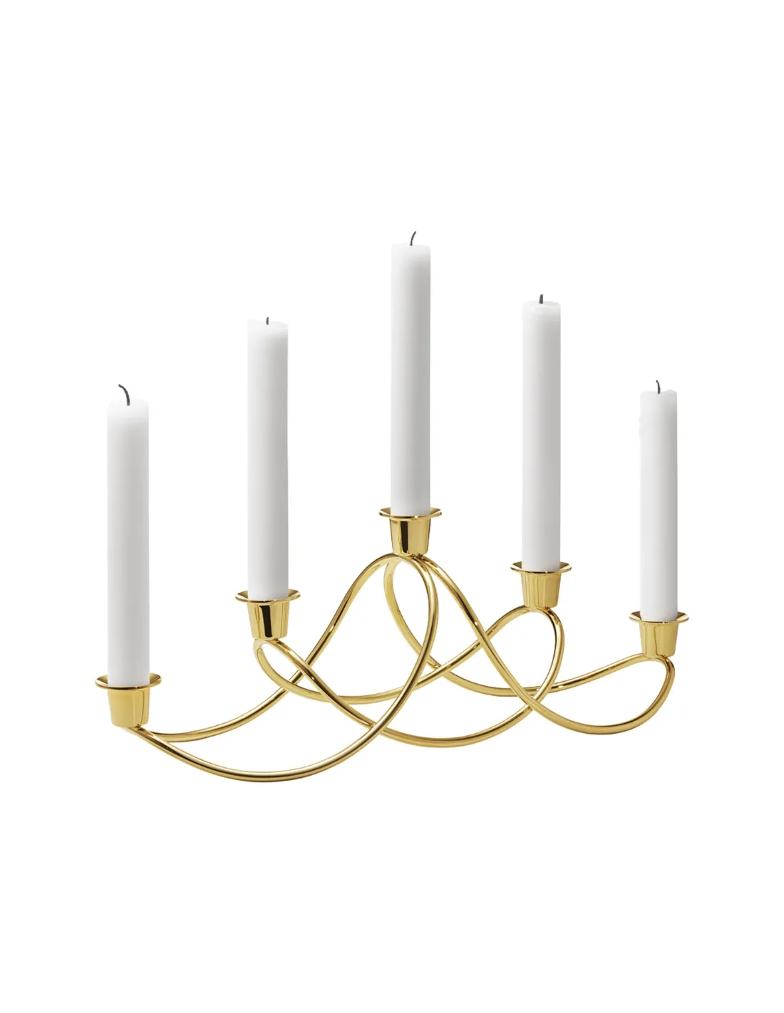 Den elegante Harmony lysestage former sig i bløde linjer og skaber et let og harmonisk udtryk på bordet og i vindueskarmen. Oplev, hvordan lyset skaber spil i den guldbelagte overflade og spreder en hyggelig stemning. Den 5-armede guldlysestage fuldender hjemmet på smukkeste vis og et enestående eksempel på tidløst skandinavisk design.