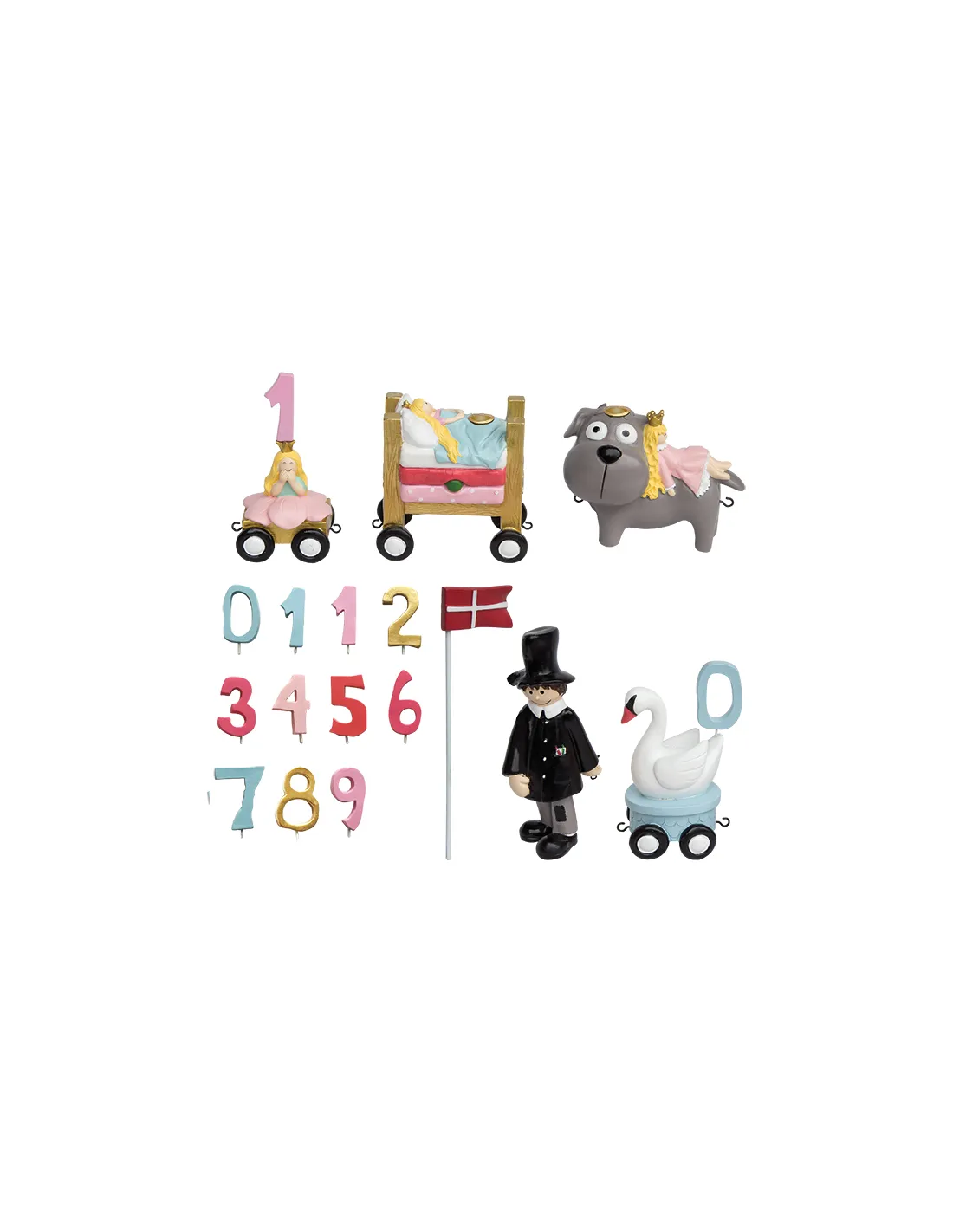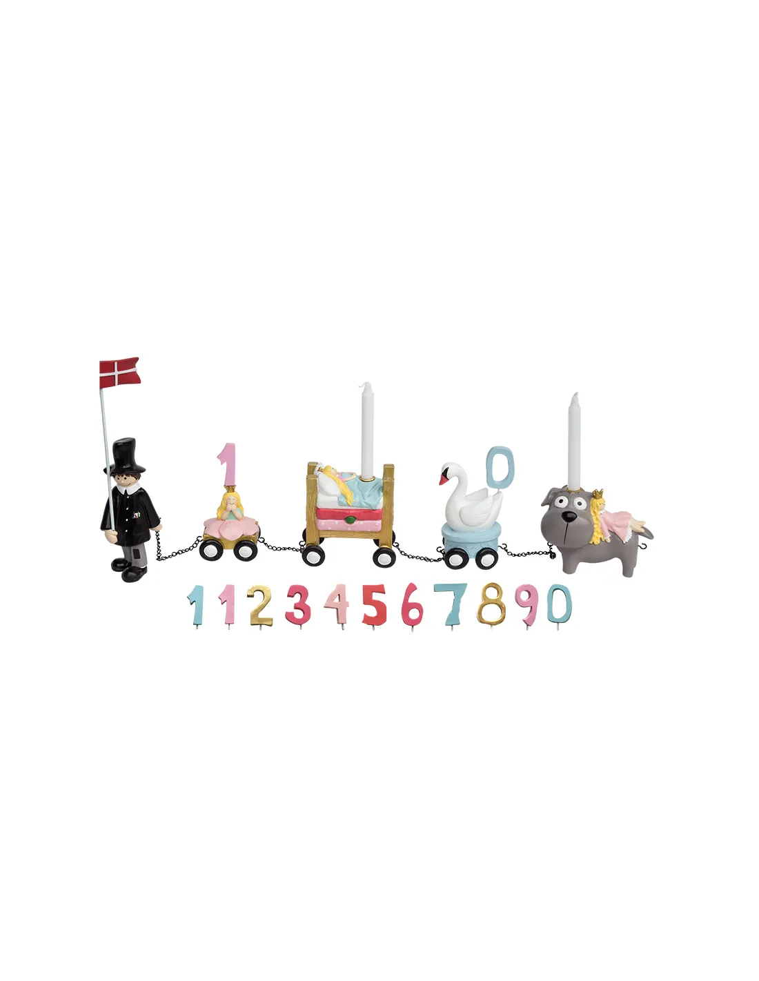 Fødseldagstog m. 11 tal/eventyr,pige. Håndmalet. Polyresin. Plads til to talnumre i toget. Inkl. flag. Mål: 17x45x6 cm.