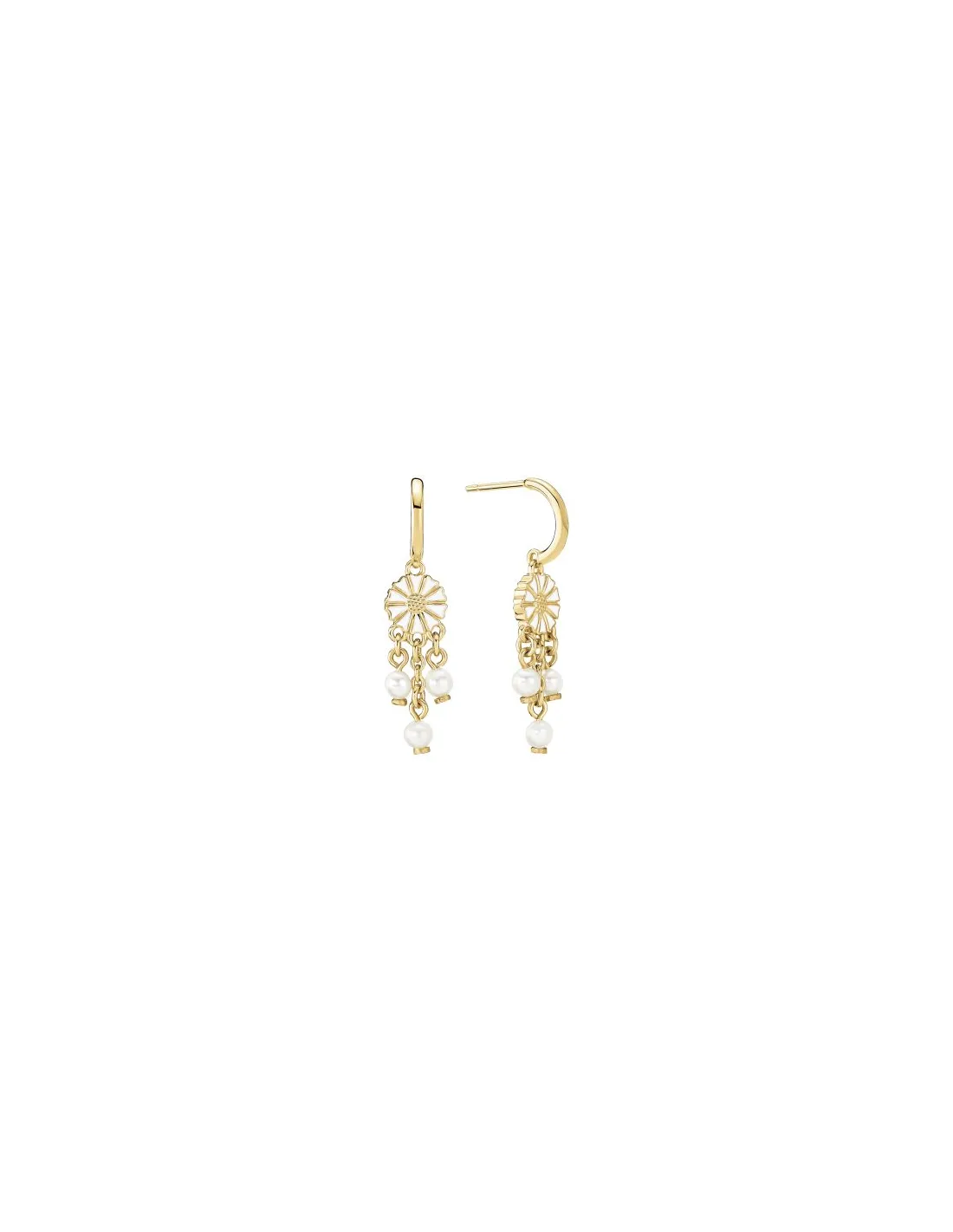 Disse smukke Marguerit ørehængere fra Lund Copenhagen forener tidløst design med naturlig elegance. Fremstillet i 24 karat forgyldt 925 sterlingsølv, er de udsmykket med en 7,5 mm marguerit i hvid emalje og tre delikate ferskvandsperler. Kombinationen af margueritens klassiske skønhed og perlernes naturlige glans gør disse ørehængere til et sofistikeret og alsidigt smykke.