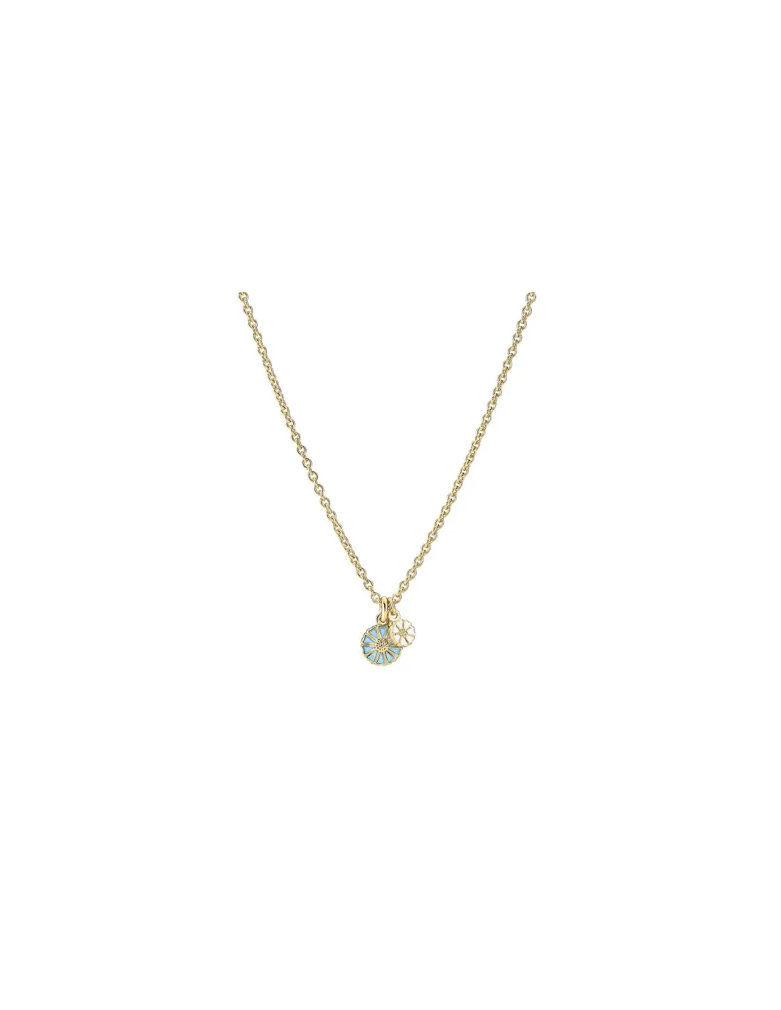 Dette Marguerit Collier fra Lund Copenhagen kombinerer klassisk design med et moderne twist. Smykket er fremstillet i 24 karat forgyldt 925 sterlingsølv og prydet med to margueritblomster i størrelserne 5 mm og 7,5 mm, begge belagt med lyseblå emalje. Kombinationen af margueritternes tidløse skønhed og den moderne lyseblå nuance skaber et smykke, der passer til enhver lejlighed.