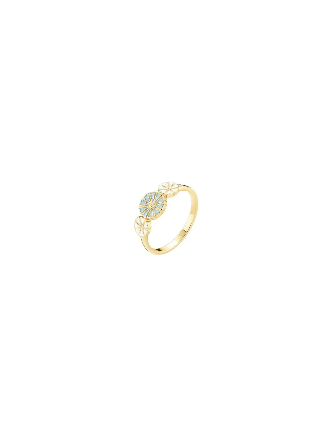 Denne smukke Marguerit-ring fra Lund Copenhagen kombinerer klassisk skønhed med et moderne twist. Fremstillet i 24 karat forgyldt 925 sterlingsølv, er ringen prydet med en stor marguerit på 7,5 mm og to mindre margueritter på 5 mm, alle belagt med en delikat lyseblå emalje. Kombinationen af margueritternes tidløse design og den lyseblå nuance skaber et unikt og stilfuldt smykke.