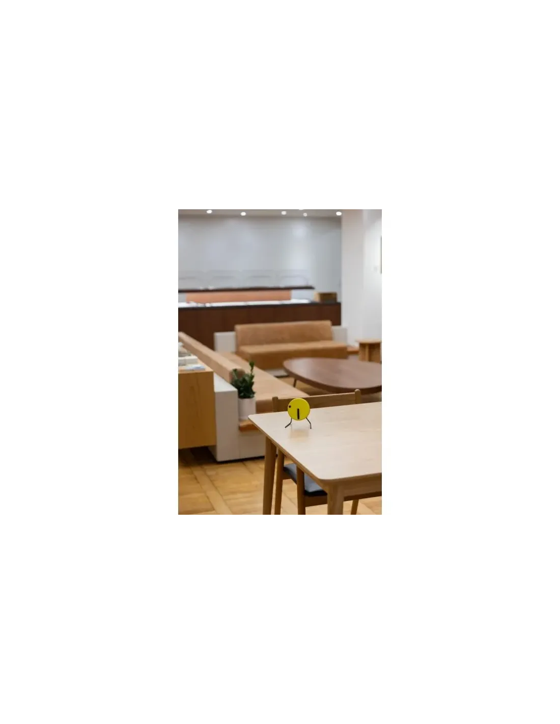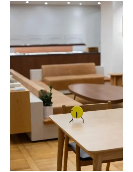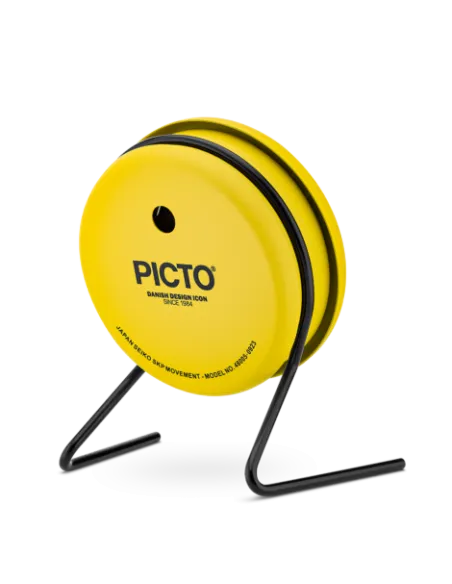 PICTO’s bordur i farven Sunny Yellow er en genskabelse af det ikoniske design fra 1984. Uret er fremstillet af aluminium og rustfrit stål og er udstyret med et præcist Seiko SKP-urværk. Med aftagelige ben kan det anvendes både som bordur og vægur, hvilket gør det alsidigt i indretningen. Det minimalistiske design, hvor timen angives med en prik på den roterende urskive, mens minutterne vises med en konventionel viser, udfordrer den traditionelle opfattelse af tidtagning. Dette gør PICTO til et unikt og tidløst stykke design, der appellerer til dem, der ønsker at sætte deres egen dagsorden og værdsætter minimalismens kunst.