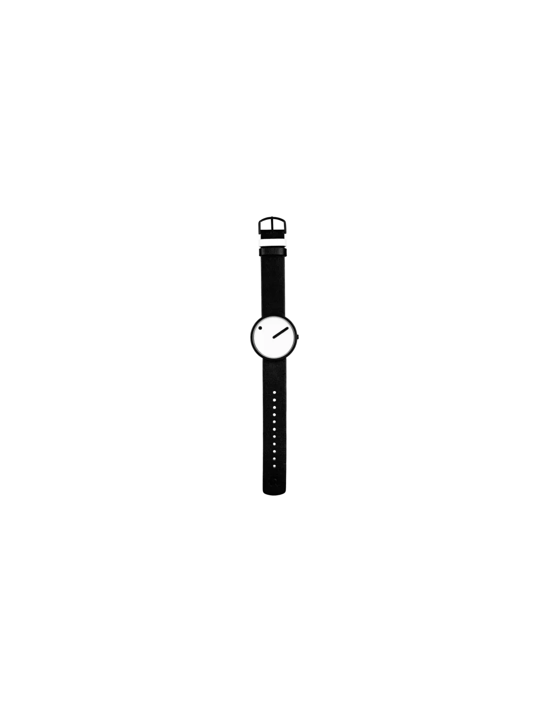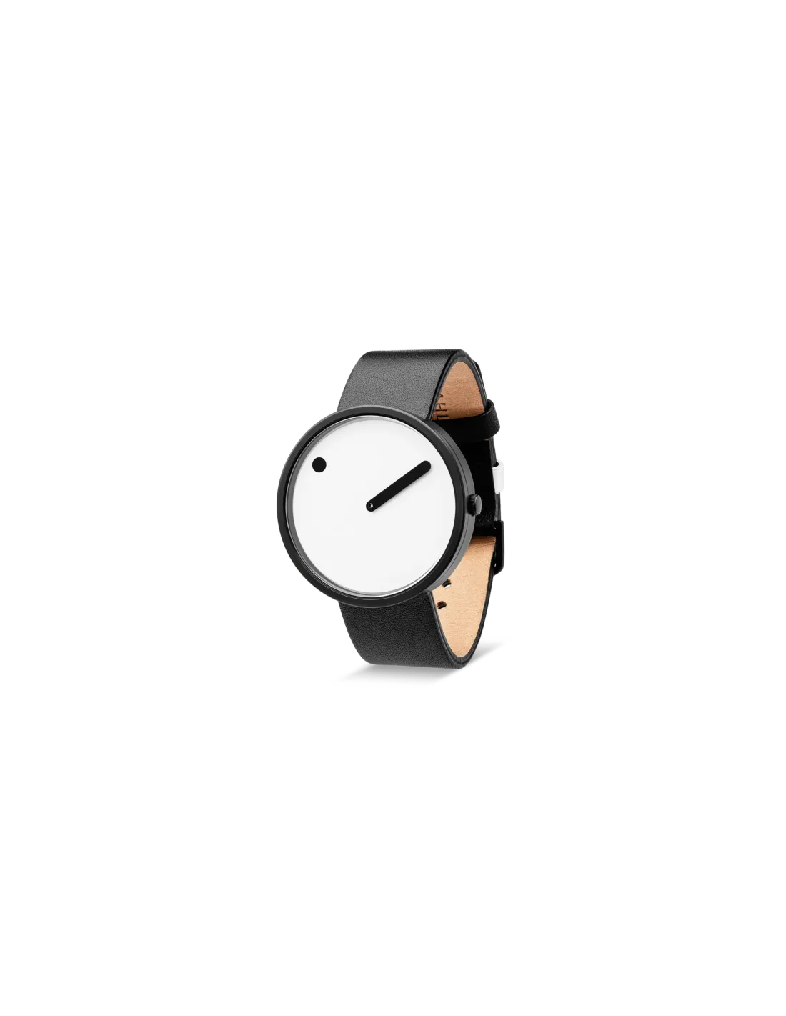 PICTO’s 34 mm ur kombinerer minimalistisk design med funktionalitet. Uret har en hvid urskive, en mat sort urkasse og en sort læderrem. Det unikke design viser timerne med en prik på den roterende urskive, mens minutterne angives med en konventionel viser. Urkassen er fremstillet af massivt rustfrit stål og beskyttet af hærdet mineralglas. Uret er vandtæt op til 5 ATM og udstyret med et præcist MIYOTA 2025 urværk. PICTO tilbyder 3 års garanti og 30 dages gratis returret.