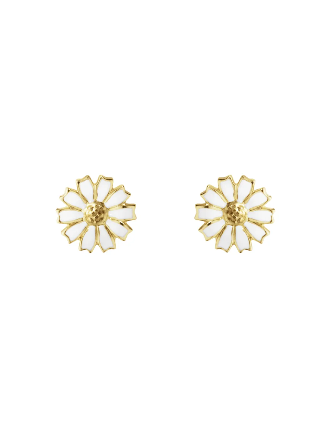 Disse ørestikker er belagt med 18 karat guld og har fine margueritter, som er håndmalet med hvid emalje. Ørestikkerne giver et strejf af blomster og forvandler ethvert outfit på et øjeblik. Det charmerende design udstråler en livsglæde, som gør ørestikkerne til en personlig gave eller en smuk tilføjelse til smykkesamlingen.