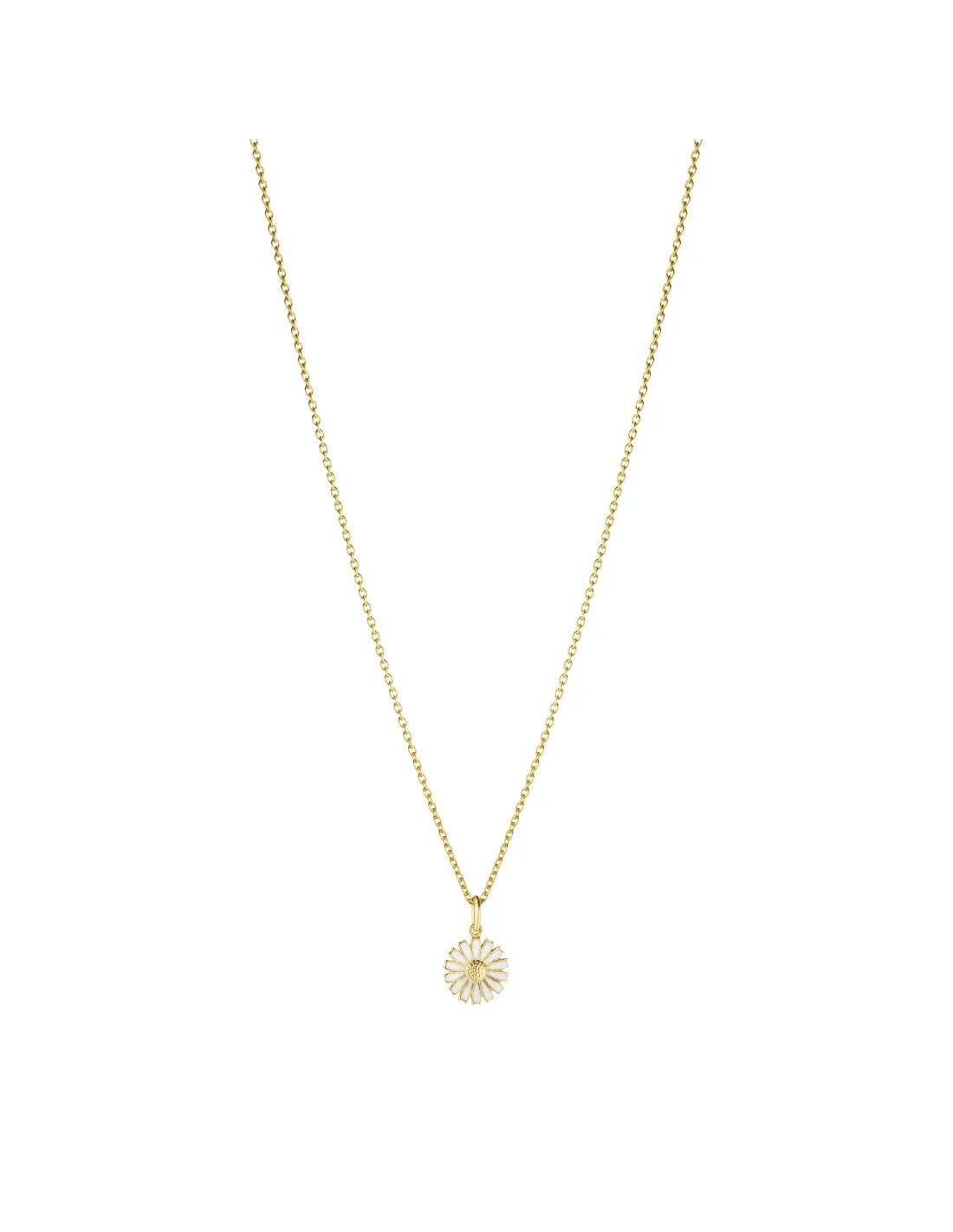 En hvid marguerit hænger i en kæde af sterlingsølv belagt med 18 karat guld og får dette smykke til at blomstre. Det elegante vedhæng er håndmalet med hvid emalje og passer til enhver stil og anledning, uanset om det er et afslappet eller formelt outfit. Halskæden med det ikoniske blomstermotiv er fra Georg Jensens populære Daisy kollektion, inspireret af en broche fra 1940’erne, som blev foræret til Hendes Majestæt Dronning Margrethe 2.
