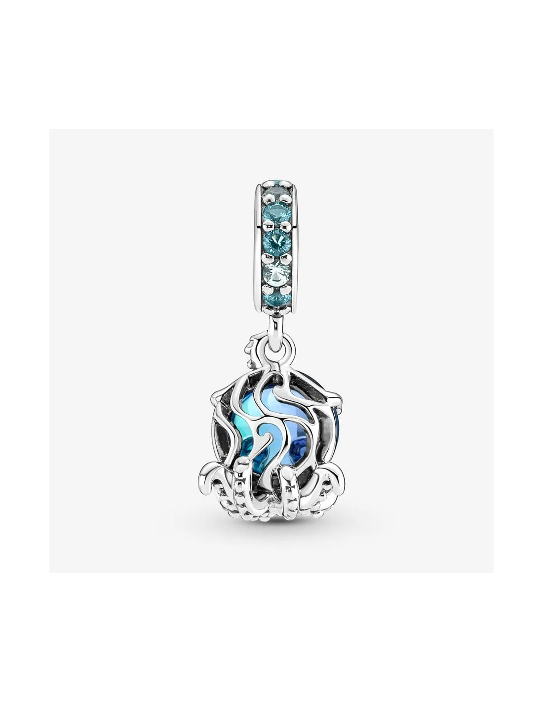 Udforsk det dybblå havs vidunderlige verden, og føj dette søde blækspruttecharm til dine Pandora Moments smykker. Dette charm med vedhæng består af smukt totonet grønt og blåt Muranoglas med et bølget, åbent mønster på bagsiden i sterlingsølv. Blækspruttens arme i sterlingsølv er rullet op som en opfordring til leg og viser det venlige og mystiske havdyrs legesyge natur. Syntetiske krystaller i tre blå nuancer giver øsknet og blækspruttens øjne ekstra glans.