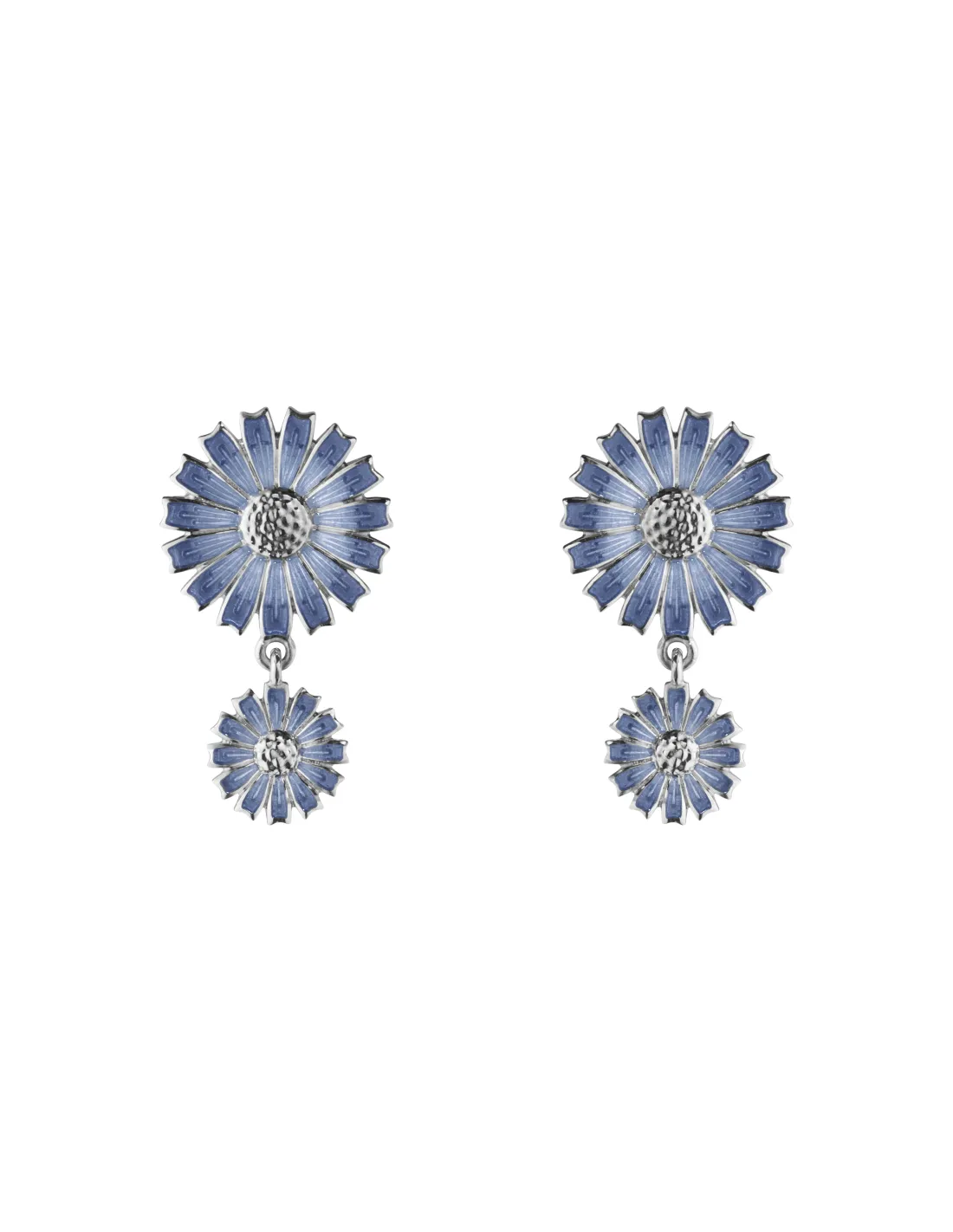 To fine margueritter i forskellige størrelser får disse øreringe i sterlingsølv til at blomstre. Øreringene er håndmalet med blå emalje og bærer det klassiske Georg Jensen-motiv i et lidt ændret design. Sættet er inspireret af en margueritbroche fra 1940’erne, som blev foræret til Hendes Majestæt Dronning Margrethe 2.