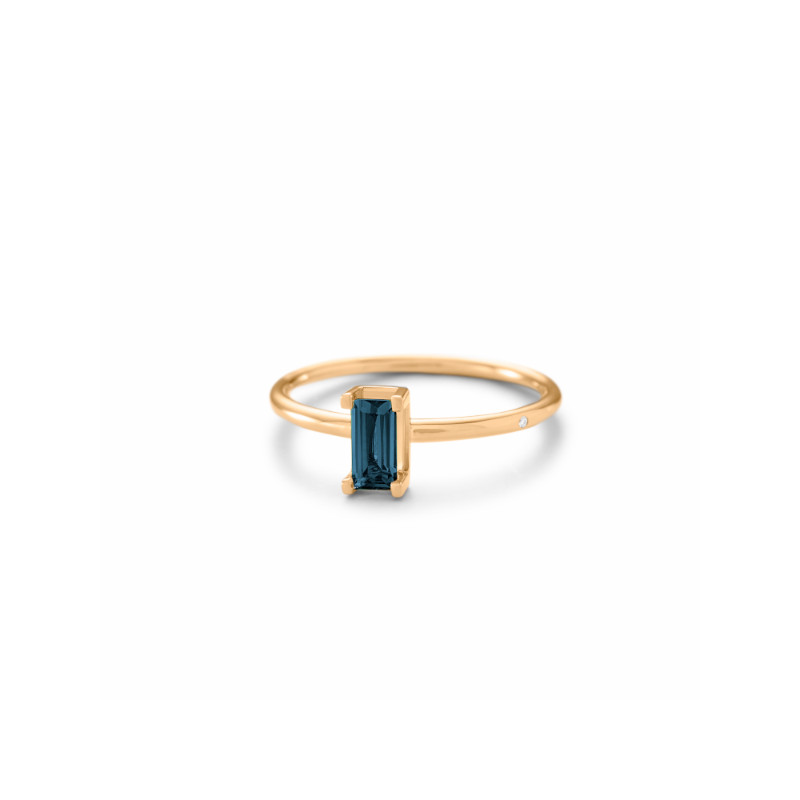 Den fine ring med rene linjer er udført i 18 kt. guld, med en smuk baguette-sleben London Blue Topas på 0,40 ct. samt den lille fine RO signatur-diamant på 0,oo3 ct.