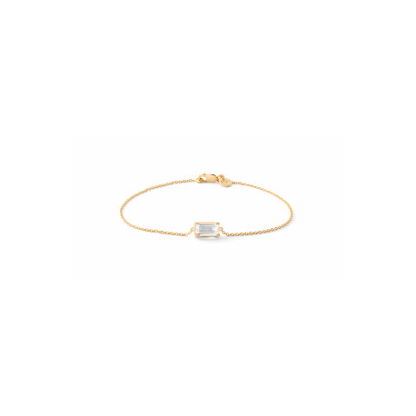 En krystalklar hvid topas pryder dette fine armbånd. Stenen er slebet med baquette-metoden som fremhæver dets skønhed og gennemsigtighed endnu mere.   Armbåndet er fremstillet i 18kt rødguld. Sat med 0,85ct hvid baguette-sleben topas samt vores Ro signatur-diamant. Brill.0.003ct TW.VS