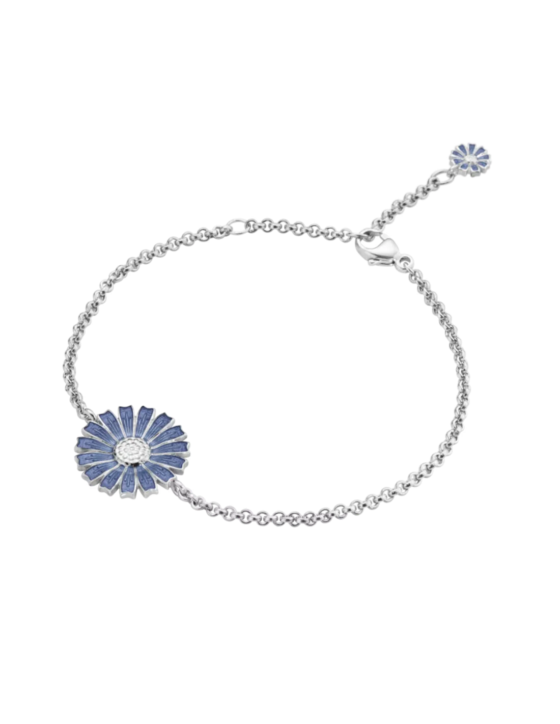 Dette Daisy armbånd i sterlingsølv bærer en smuk, blomstrende marguerit, som er håndmalet med blå emalje. Armbåndet er et alsidigt smykke og perfekt til hverdagsbrug. Designet er en del af Georg Jensens ikoniske Daisy kollektion, som oprindeligt var inspireret af en margueritbroche fra 1940’erne, foræret til Hendes Majestæt Dronning Margrethe 2.