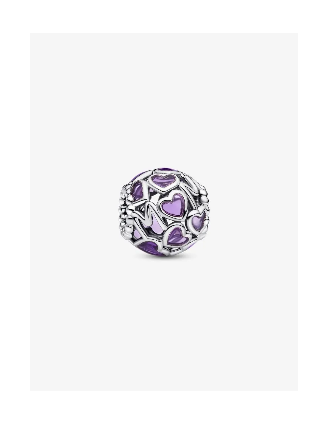 Giv dit look et køligt farvestrejf med et flettet hjerte morcharm. Transparente lavendelfarvede emaljehjerter med kanter i sterlingsølv danner et rundt charm, der også har mikrokugler og ordet "MOM" med store bogstaver. Charmet er inspireret af den følelse af sammenhold, vi alle deler– og især de særlige bånd, der er skabt af moderskab – og vil minde dig om de bånd, der betyder mest.